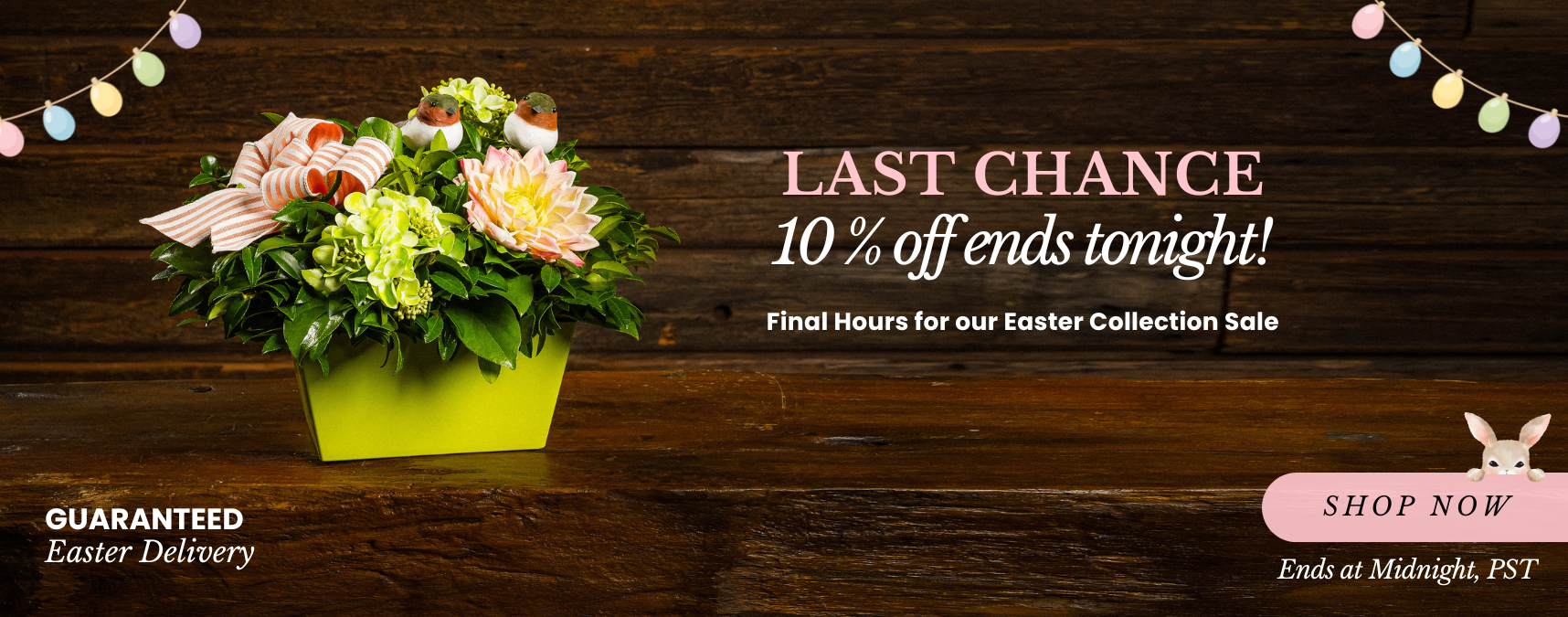Today’s the final day! Don’t let these Easter specials hop away. 10%-OFF all Easter Collection items with guaranteed delivery by Easter. Order now for spring decorating, Easter gatherings, or to send a thoughtful gift. Hurry - ends at midnight!