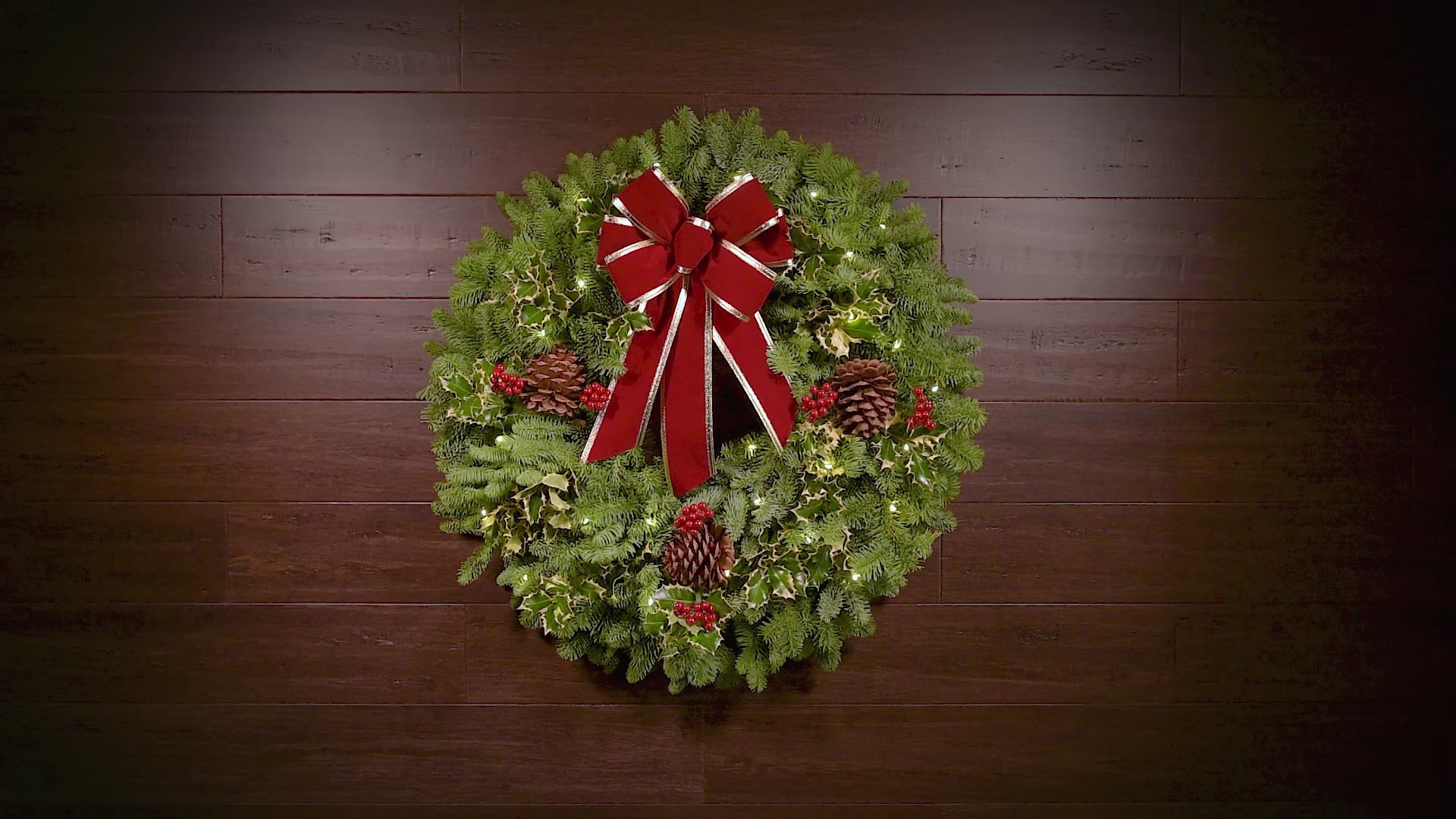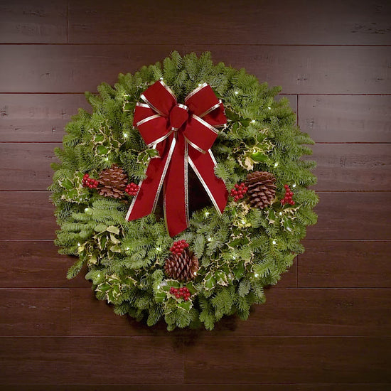 Our Mixed Holly Christmas wreath combines two favorites of the holiday season, aromatic noble fir and holly! Variegated holly is mixed throughout the fresh and fragrant base of noble fir, all hand-selected locally. The base of fresh greenery is accented with natural pinecones and a lush hand-tied red velveteen bow. Simply perfect for Christmas! Available in 26" & 32" sizes. 4-Pack contains four 26" wreaths and ships to one address.
