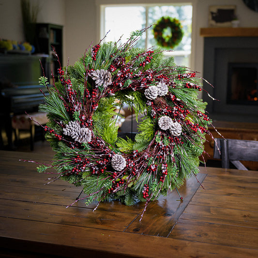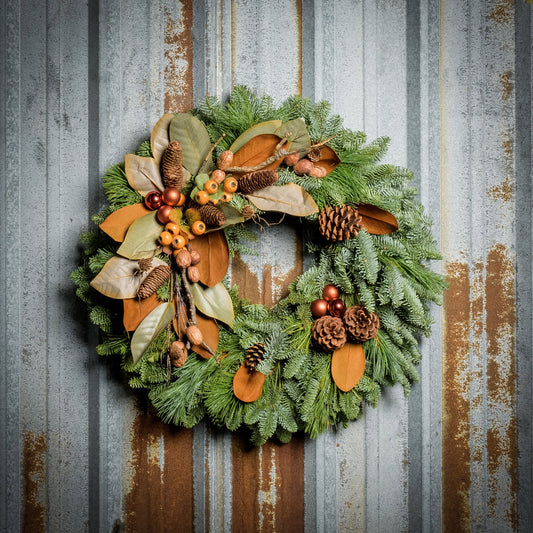We offer a wide variety of home decor wreaths to meet everyone's holiday decorating needs. For people looking to start decorating in the earlier holiday season months, the farm has many options including winter wreaths like Premium Silver and Magnolia Bay. These are all wreaths that are best to ring in the holiday season and colder weather. For those of you looking for more silver and blue tones, our winter wreaths are perfect. For those wanting to welcome the season of giving and want something in your home that signifies the start of fall or Thanksgiving, the Magnolia Bay and Bittersweet Berries wreaths are the way to go. If you have a farmhouse and are looking for more of a rustic vibe, wreaths like Farmhouse Holiday, Country Chic, and Country Christmas offer a modern country look with plaid bows, frosted swigs, red berries, and pinecones.