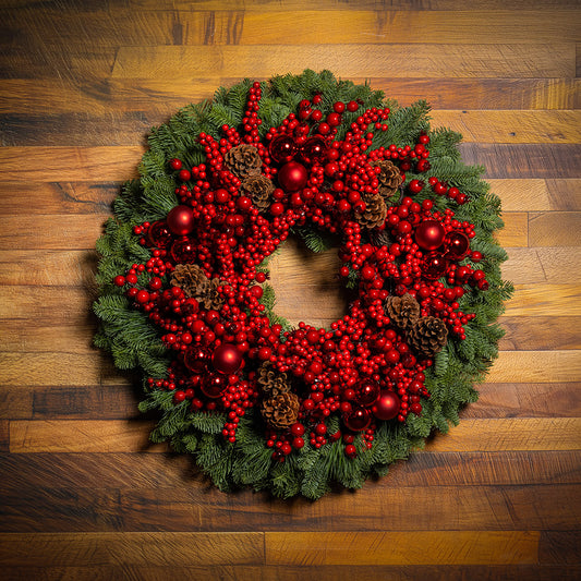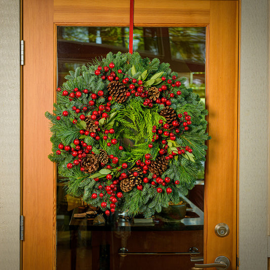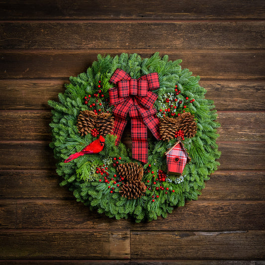 For Christmas decorating purposes, we have some of the most beautiful wreaths you'll ever see. You have many options to choose from like pre-lit wreaths with snowflakes, and lights, unlit wreaths with beautiful hand-tied multi-color bows, and some that are adorned with different colored ornaments on the bristles, as well as berry clusters, pinecones, and battery-operated warm white lights. We even have wreaths that celebrate the furry friend in your life. Make sure you check out the Lab Love wreaths. We also offer wreaths with minimal designs so you can add your own eucalyptus, poinsettias, or lights to brighten up your home. When you order online, you also have the option of adding a door hanger so that placing your wreath for everyone to see is quick and efficient.