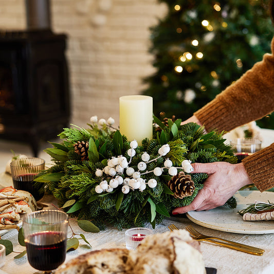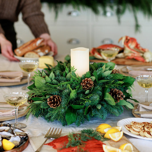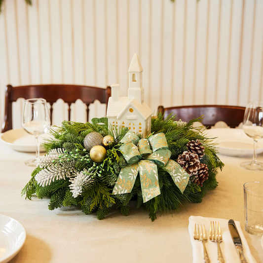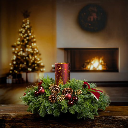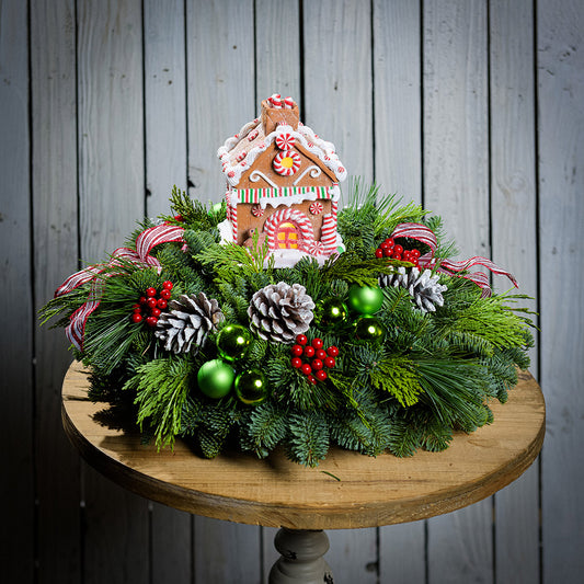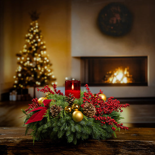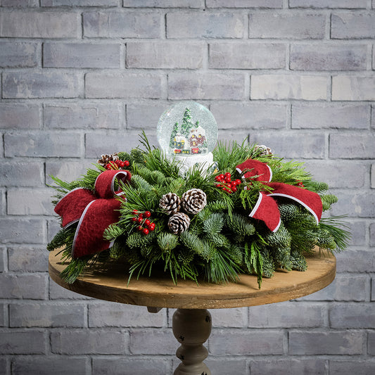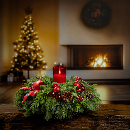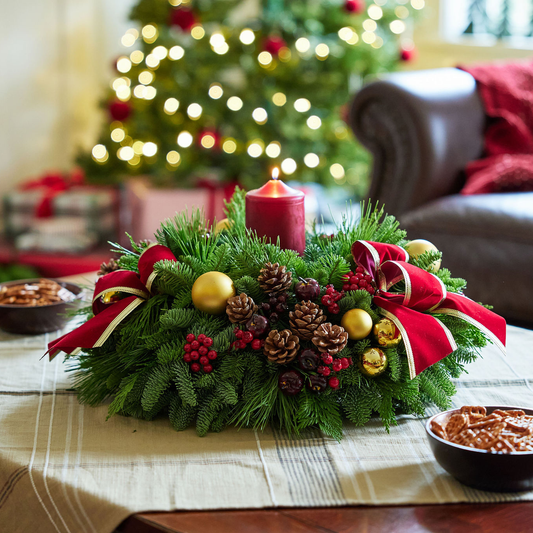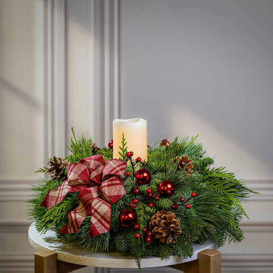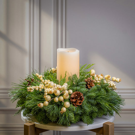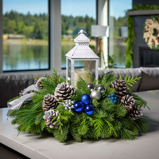 Our fresh evergreen centerpieces are always best sellers and can be used in many different ways. Many people enjoy putting them on their dining tables as table centerpieces to look at during mealtime. Many of the centerpieces available for purchase, like the Pacific Bay Centerpiece, Small Holiday Centerpiece, Cascade Centerpiece, Radiant Holiday, and Snowberry Glow, among a few others, all have candle holders for floating candles and pillar candles to bring more Christmas light to your space. You can even set your own tea lights around the centerpieces if you're looking to lighten a darker corner of the house.