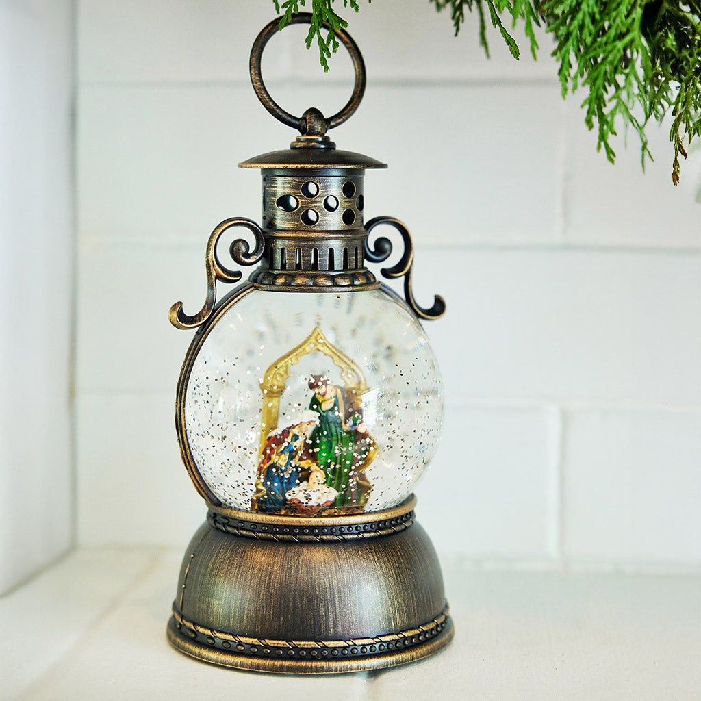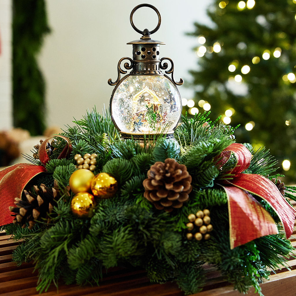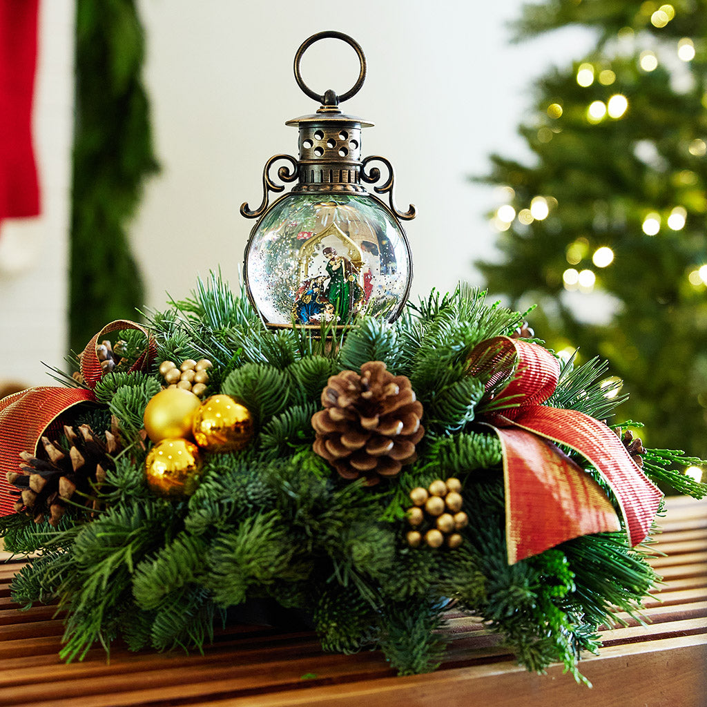 As Christmas approaches, many families look forward to the joy and warmth that comes with decorating their homes for the holidays. An important reminder of the true meaning of Christmas is the nativity, a beloved and timeless theme that has been cherished by families for centuries. As you gaze at the nativity scene, you're reminded of the wonder of the birth of Jesus and the joy and hope he brings to the world. Our new Away in the Manger centerpiece celebrates the nativity beautifully with a gorgeous water globe that lights up with a gentle sparkle. A scene with Mary, Joseph, and Baby Jesus is arranged peacefully inside an elegant bronze-colored globe which casts a delicate white light that swirls with glittery snow. It comes with a built in timer so it will turn off by itself after 6 hours. The globe sits atop a bed of fresh noble fir, cedar, and white pine with accents of natural pinecones, gold berries, gold ball ornaments, and gold bow tucks. The calm and serene arrangement is perfect for reflecting on the season's deeper significance. This centerpiece is a beautiful addition to any home and is sure to bring joy and peace to all who see it. The water globe requires 3 AA batteries (not included). This centerpiece measures at approximately 14" tall x 18" across.
