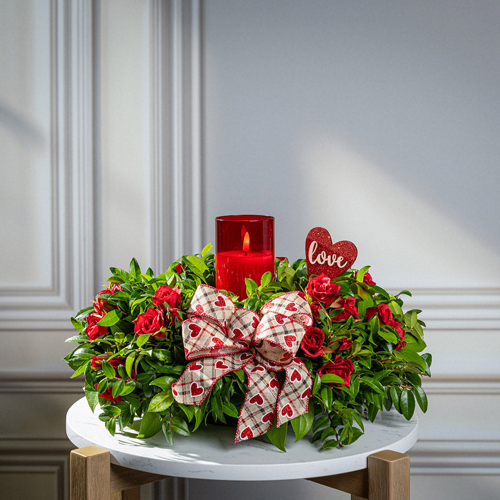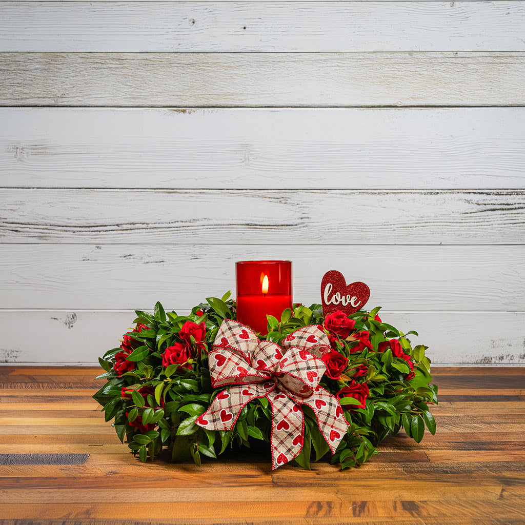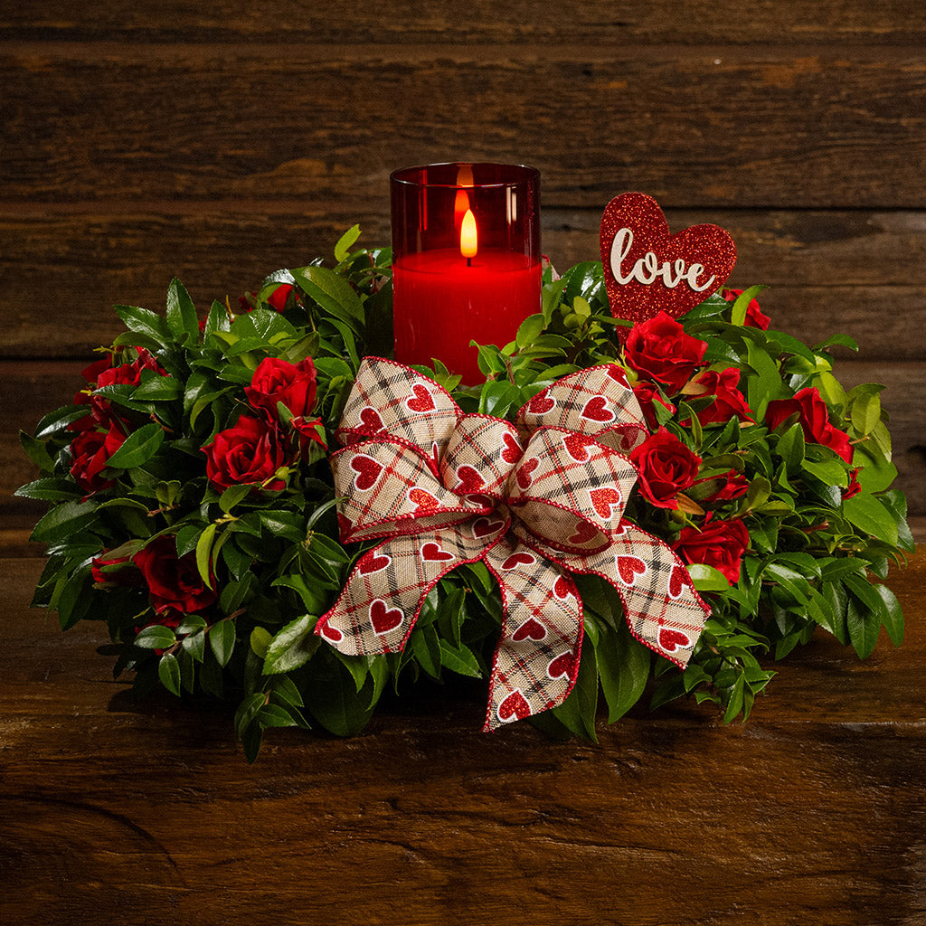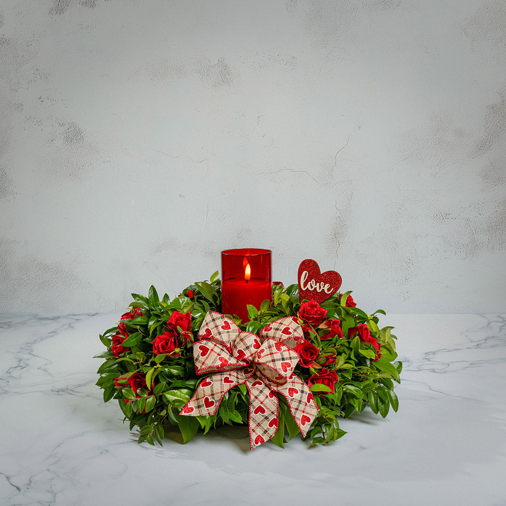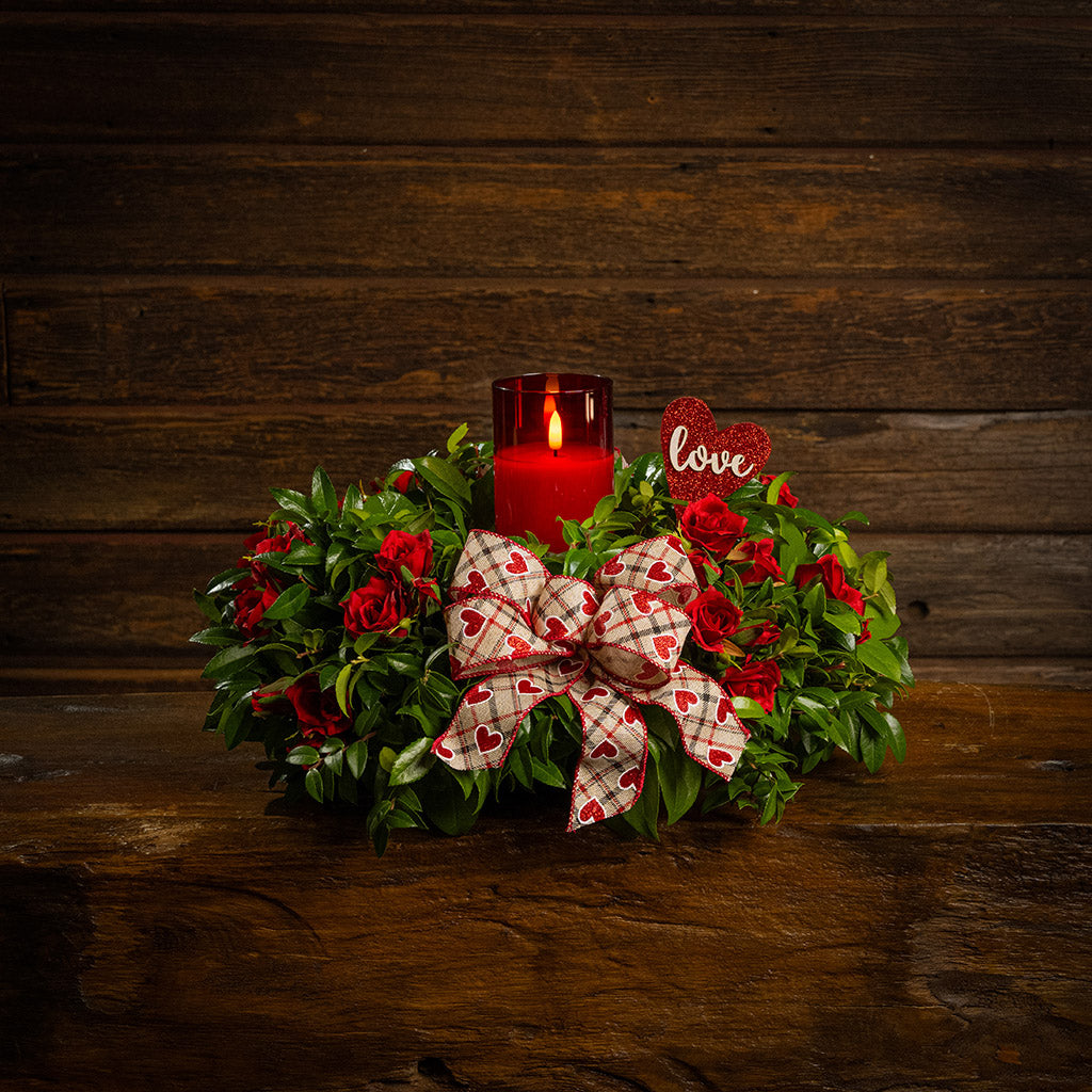 Celebrate the loving spirit of Valentine's Day or any special day with our gorgeous Be Mine centerpiece. This elegant arrangement effortlessly captures the essence of love and appreciation. We combine beautiful faux, artificial mini red roses with fresh salal and green huckleberry to create a vibrant combination. A charming hand-tied heart bow and a heart-shaped glittery love sign are nestled amidst the blossoms and greenery. A red glass LED candle at the heart of the arrangement casts a soft, warm glow. Like a poem of love, this centerpiece is sure to warm their heart! The LED candle measures 3" wide x 6" tall and requires two AA batteries (not included). The candle includes a timer and will automatically turn off after several hours. This centerpiece measures approximately 16” across x 9” tall.