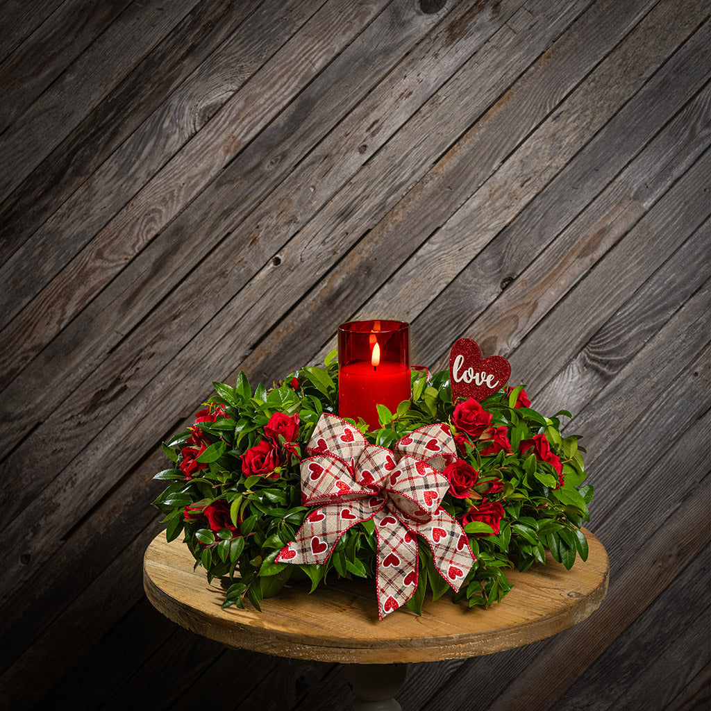 Materials: Fresh salal and green huckleberry with faux mini red roses, a red heart “love” sign, a red heart bow, and a red LED candle.
