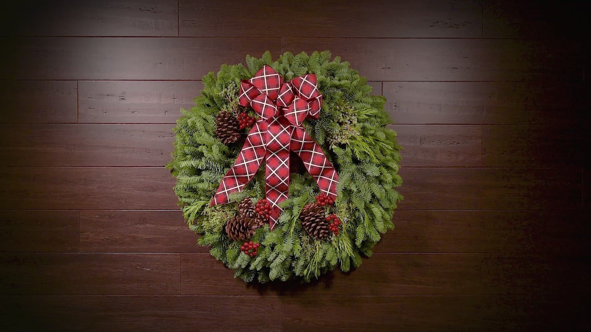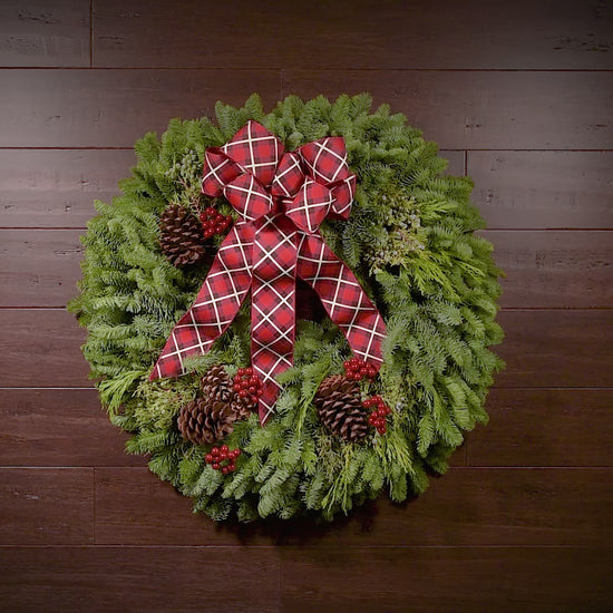 Materials: noble fir, cedar, and juniper with faux red berries, natural pinecones, and a red plaid bow