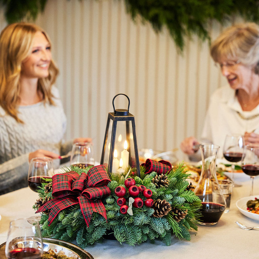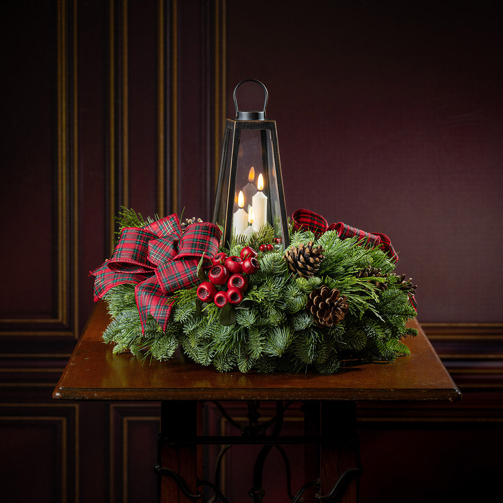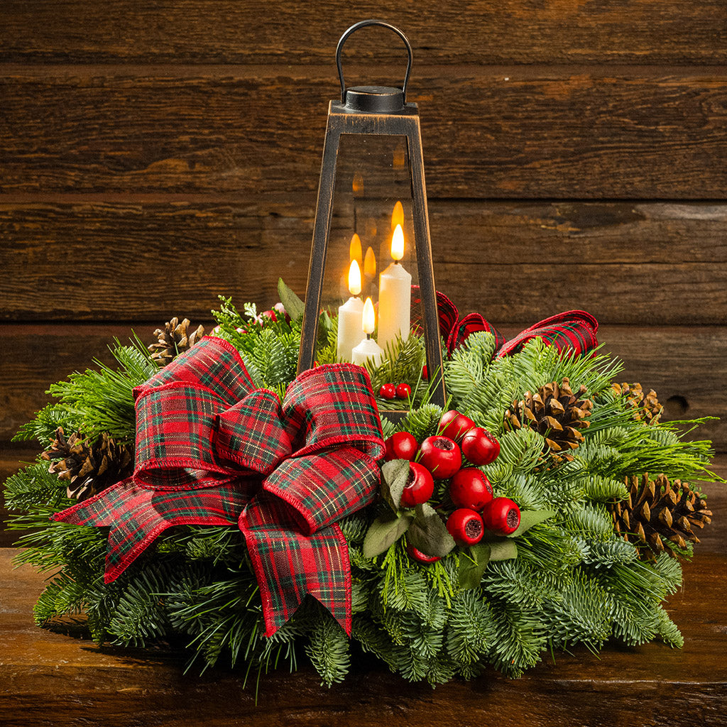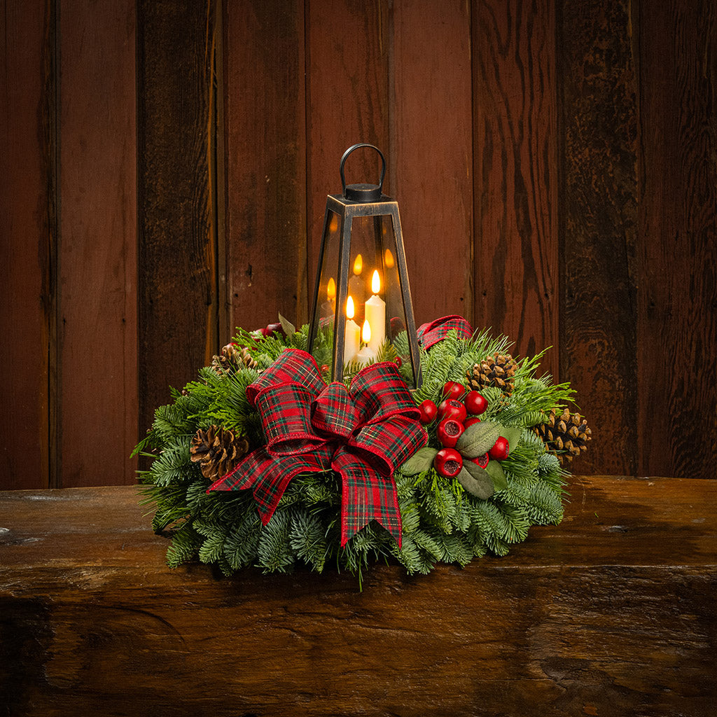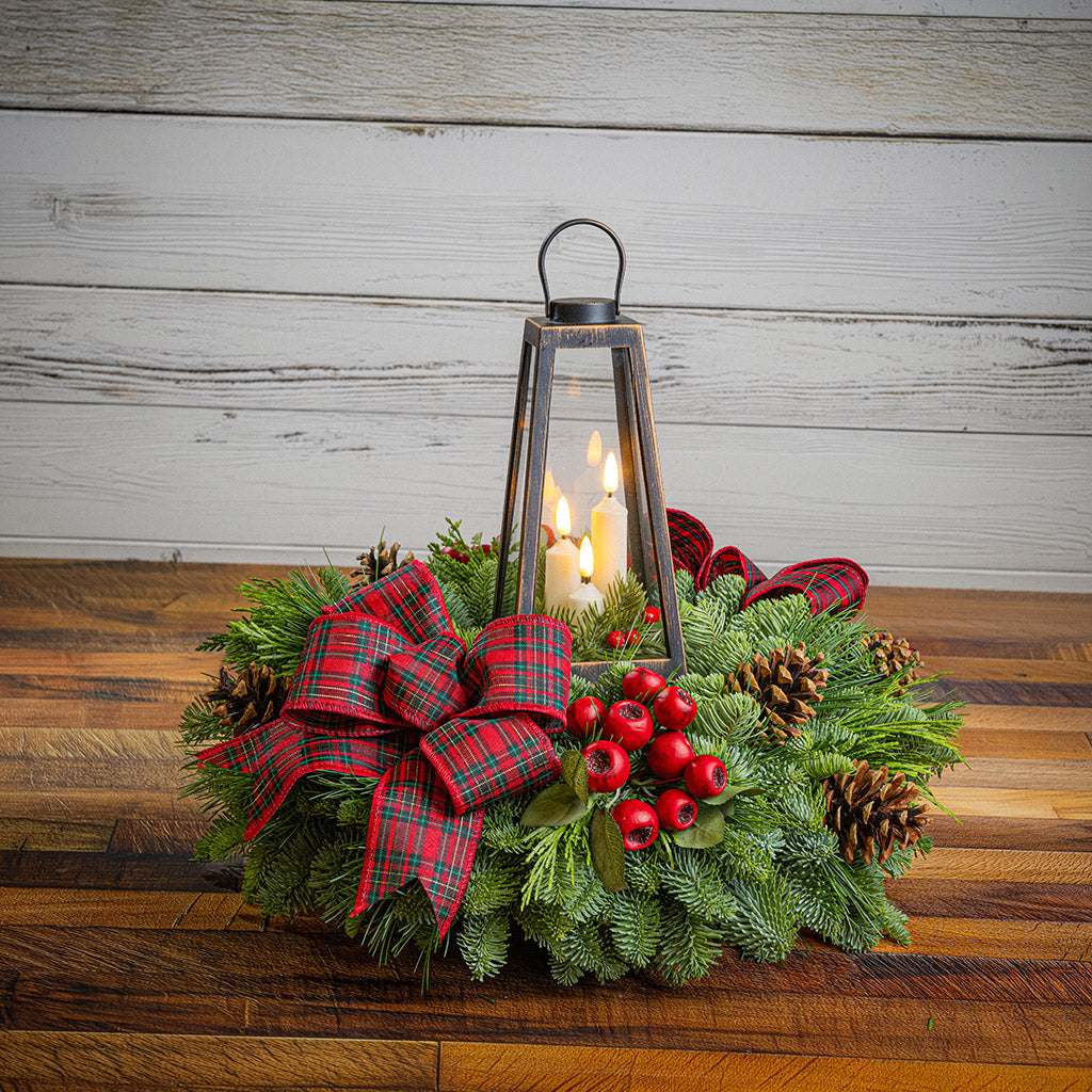 Capture the heartwarming magic of home with our warm and welcoming By the Fireside centerpiece! Creating an inviting glow, this centerpiece feels just like hometown comfort. Hand-assembled with a base of noble fir, cedar, and pine, this beauty features deep red faux berries, faux leaves, and real pinecones that add a natural touch and tie together the woodland accents. A gorgeous red and green plaid bow brings the perfect blend of timeless charm and elegance. At its center, a rustic bronze metal lantern sits within the greenery, containing three battery-operated candles that echo the feel of a crackling hearth. Perfect for sending to someone in need of some holiday coziness, for your own festive table, and all those quiet winter moments worth remembering.