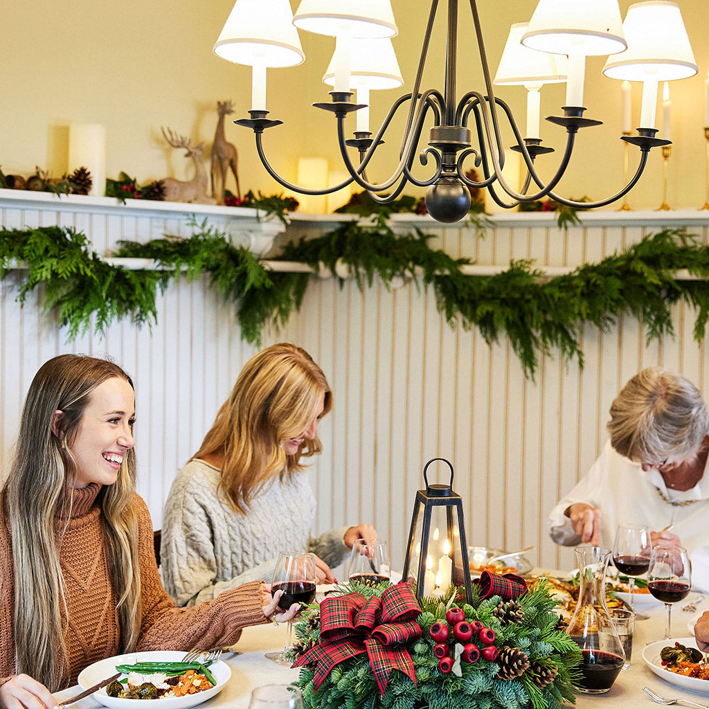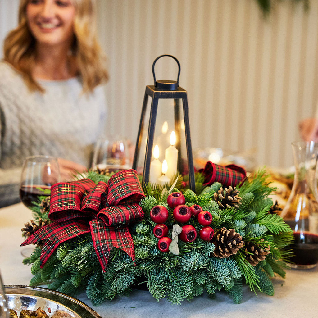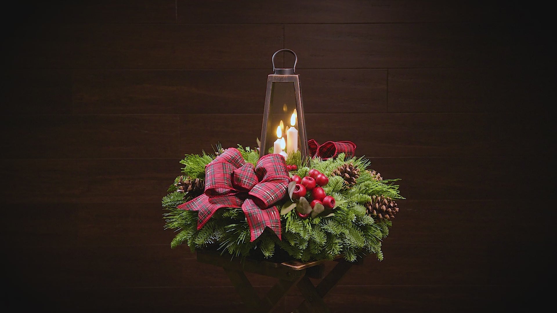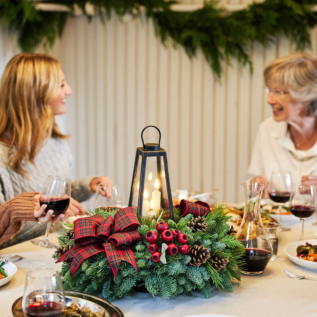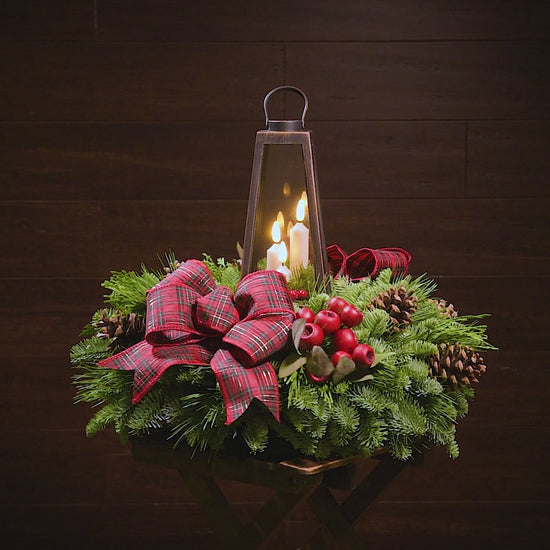 Capture the heartwarming magic of home with our warm and welcoming By the Fireside centerpiece! Creating an inviting glow, this centerpiece feels just like hometown comfort. Hand-assembled with a base of noble fir, cedar, and pine, this beauty features deep red faux berries, faux leaves, and real pinecones that add a natural touch and tie together the woodland accents. A gorgeous red and green plaid bow brings the perfect blend of timeless charm and elegance. At its center, a rustic bronze metal lantern sits within the greenery, containing three battery-operated candles that echo the feel of a crackling hearth. Perfect for sending to someone in need of some holiday coziness, for your own festive table, and all those quiet winter moments worth remembering.