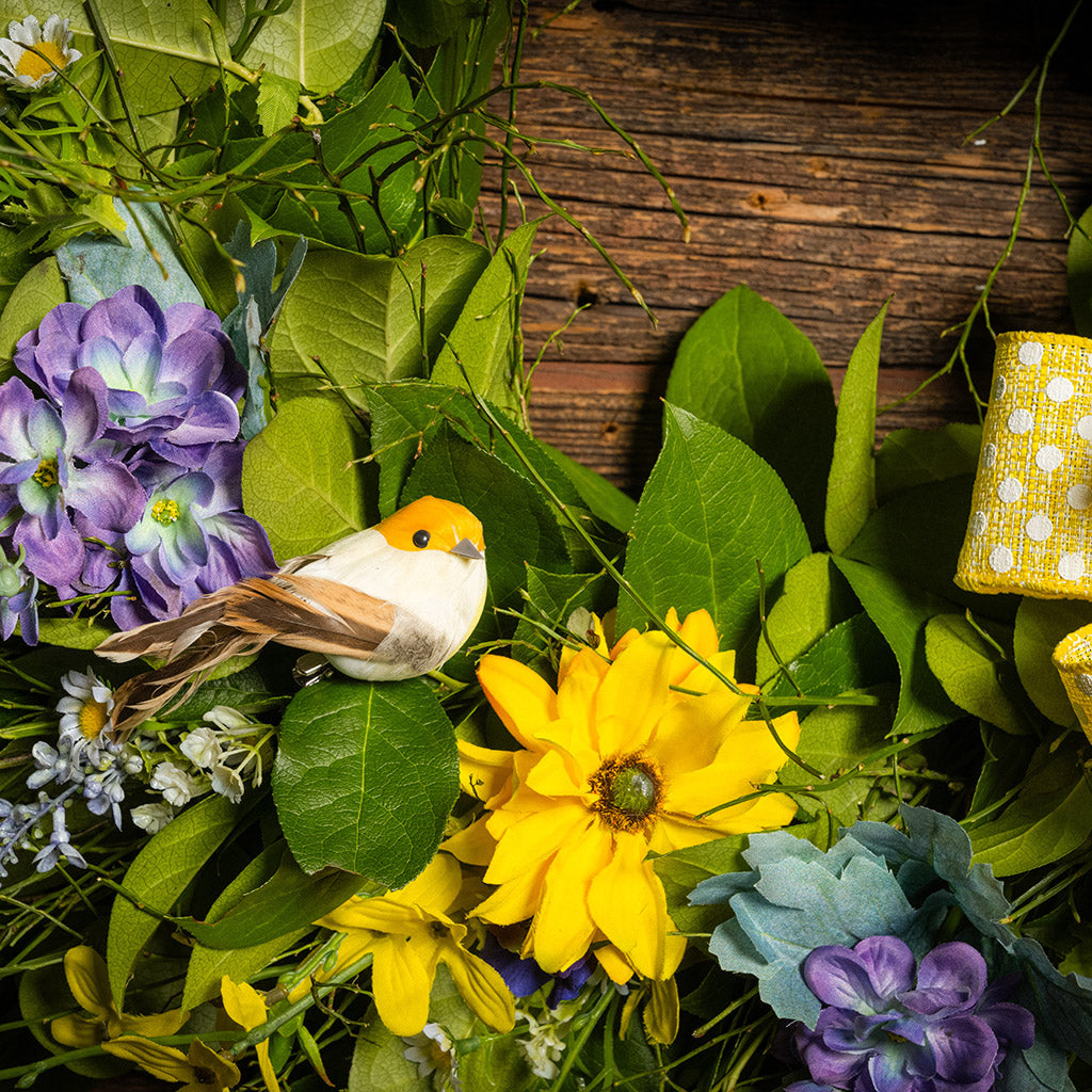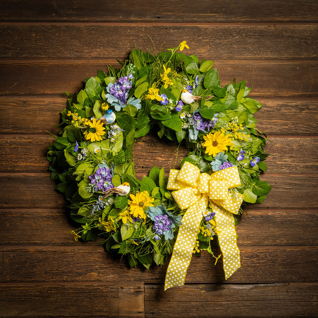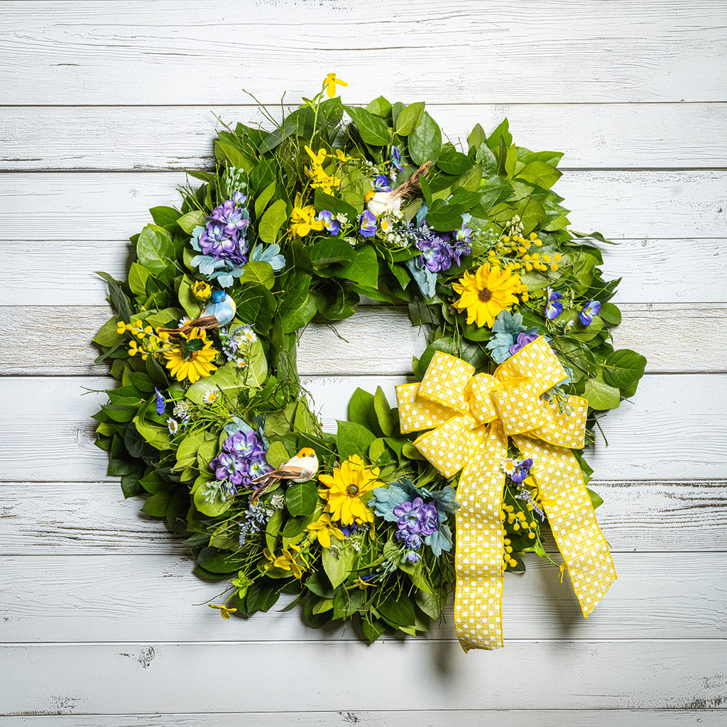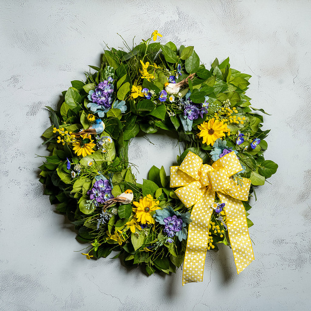 Like a beautiful snapshot of a spring flower garden, our Cheerful Chirpers wreath welcomes the charm and serenity of spring into your home! We begin with a lush base of fresh salal and sweet huckleberry, caringly designed by hand. We then add bursts with lifelike faux lavender pansies, faux yellow forsythia flowers, faux purple delphinium flowers, and faux yellow daisies to brighten your home with springtime joy. Delicately selected within the greenery are three lively bird decorations, all finished with a wonderful yellow polka-dot bow. Let this charming 26” wreath deliver the joy and allure of spring to you or your loved ones. Adding this cheery wreath to your door or space will surely usher in the vibrant spirit of spring and the outdoors to everyone around! Decorated with three cute birds, it’s ideal for bird lovers!