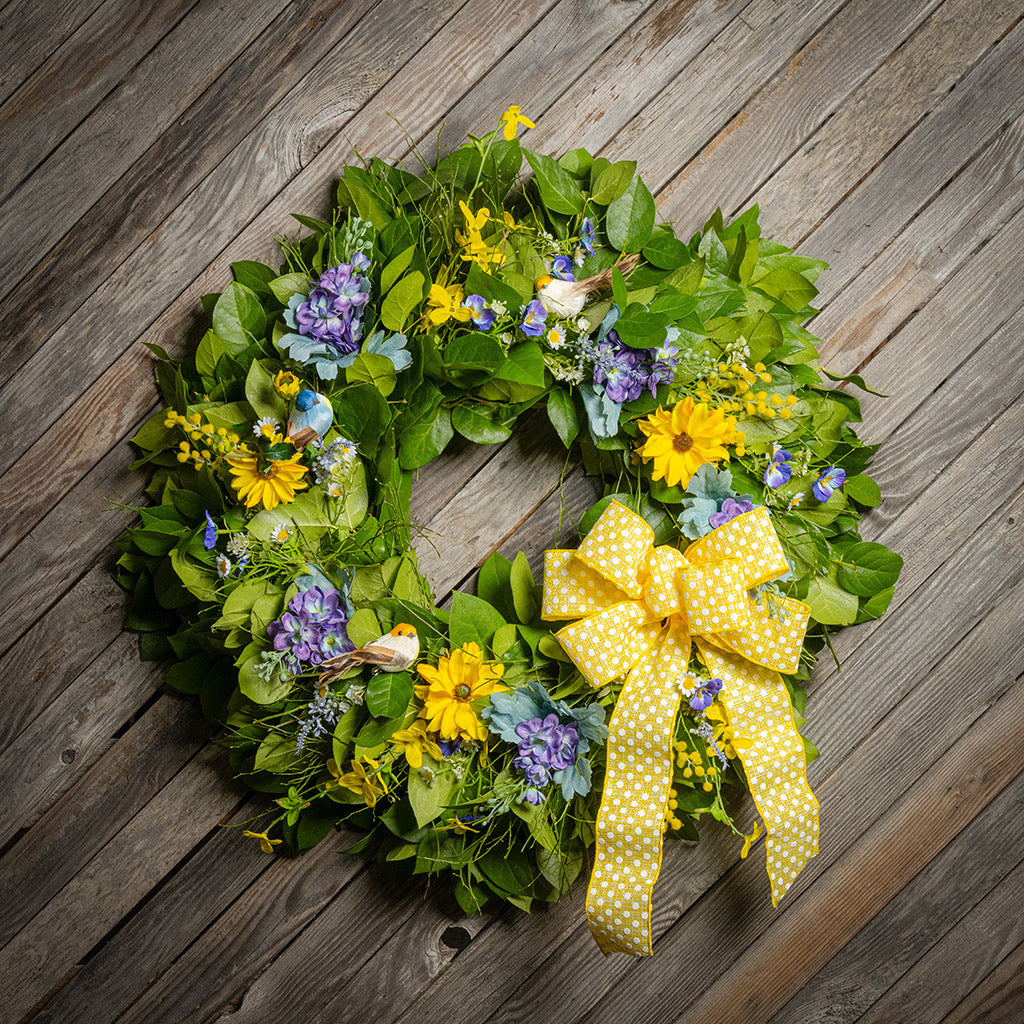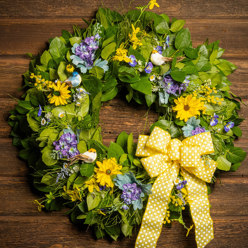 Like a perfect snapshot of a spring flower garden, our Cheerful Chirpers wreath welcomes the beauty and serenity of spring into your home! We begin with a lush base of fresh salal and sweet huckleberry caringly crafted by hand. We then add bursts with lifelike faux (artificial) lavender pansies, faux yellow forsythia flowers, faux purple delphinium flowers, and faux yellow daisies to brighten your home with springtime cheer. Delicately assembled within the greenery are three lively bird decorations, all finished with a stunning yellow polka-dot bow. Let this elegant 26” wreath deliver the joy and allure of spring to you or your loved ones. Adding this cheery wreath to your door or space will surely usher in the vibrant spirit of spring and the outdoors to everyone around! Adorned with three cute birds, it’s perfect for bird lovers! This all-natural wreath is handmade with salal and huckleberry branches collected locally from the foothills of the Cascade and Olympic Mountains here in Washington state.