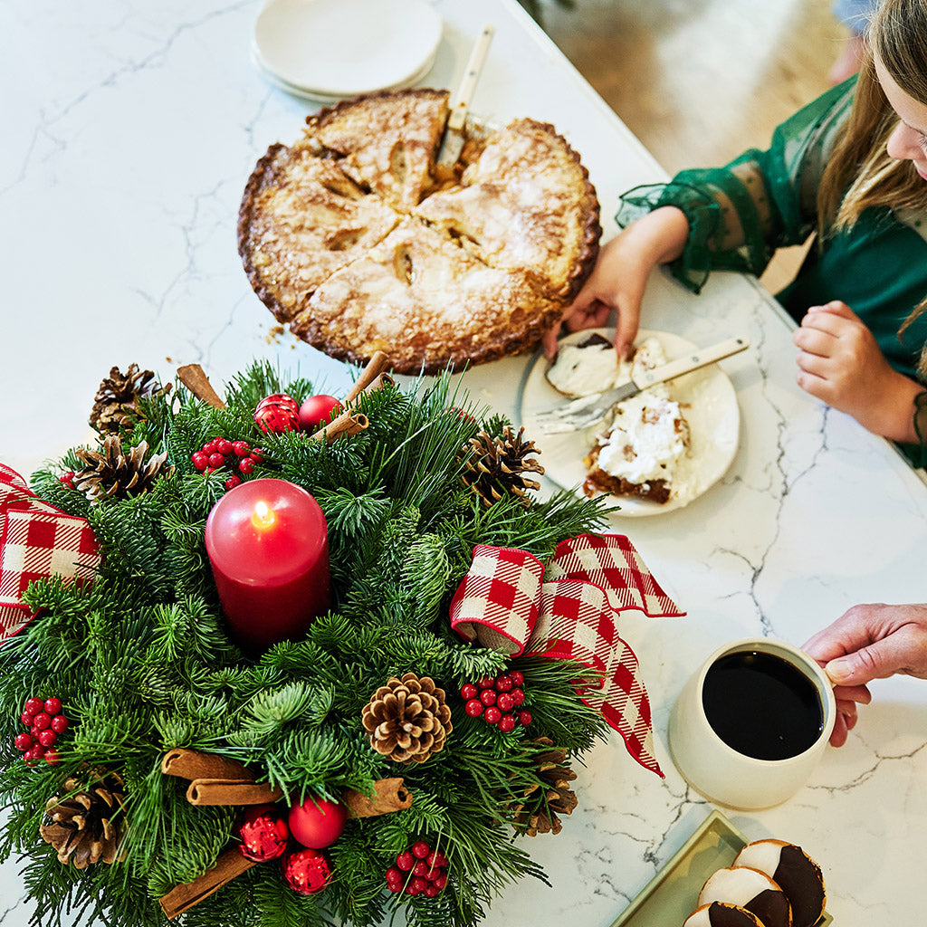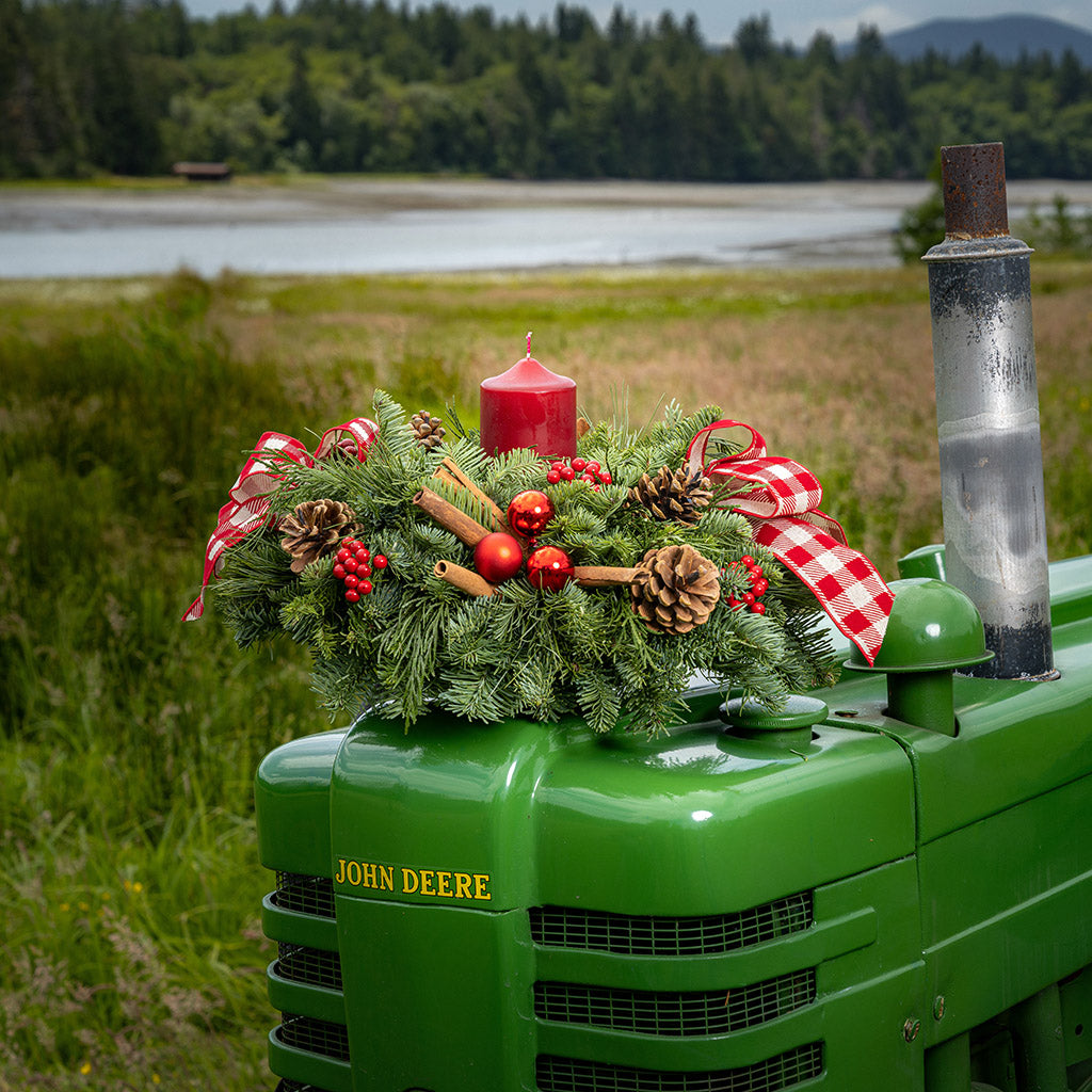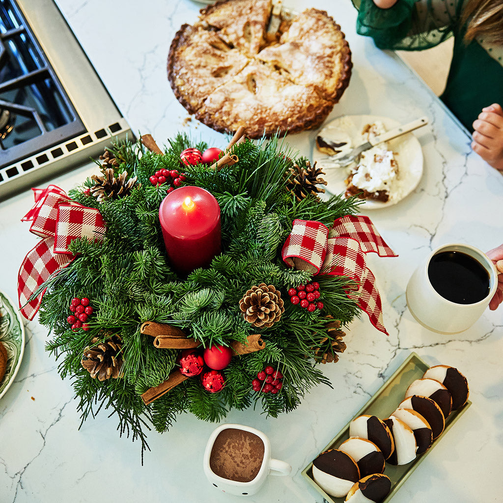Like the wonderful, warm and exciting feelings of Christmas morning, this delightful country-style centerpiece will spread joy and cheer throughout the home. A country-style plaid bow and real cinnamon sticks add rustic, yet elegant touches to this farmhouse-style holiday centerpiece, while cinnamon-scented pinecones give off a warm cinnamon scent. Assembled on a base of fresh and fragrant noble fir, white pine, and cedar, we added a beautiful blend of red berries, pinecones, and shiny red ball ornaments. The red and white plaid bows add a pop of country charm, while a pomegranate-red pillar candle centered in the bountiful live evergreen arrangement finishes this delightful addition to your Christmas festivities! Measures 18” across x 10” tall. The round wood display base in some photos is not included.