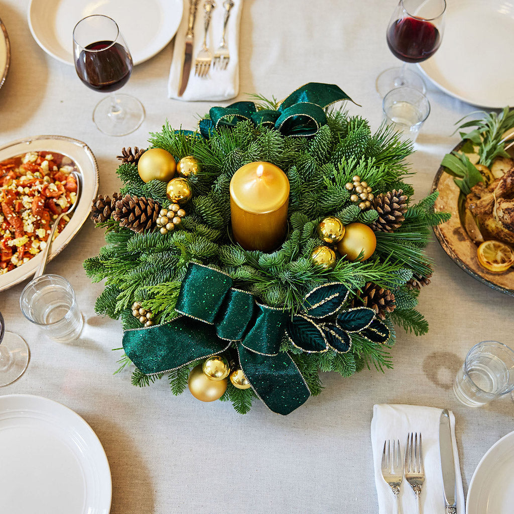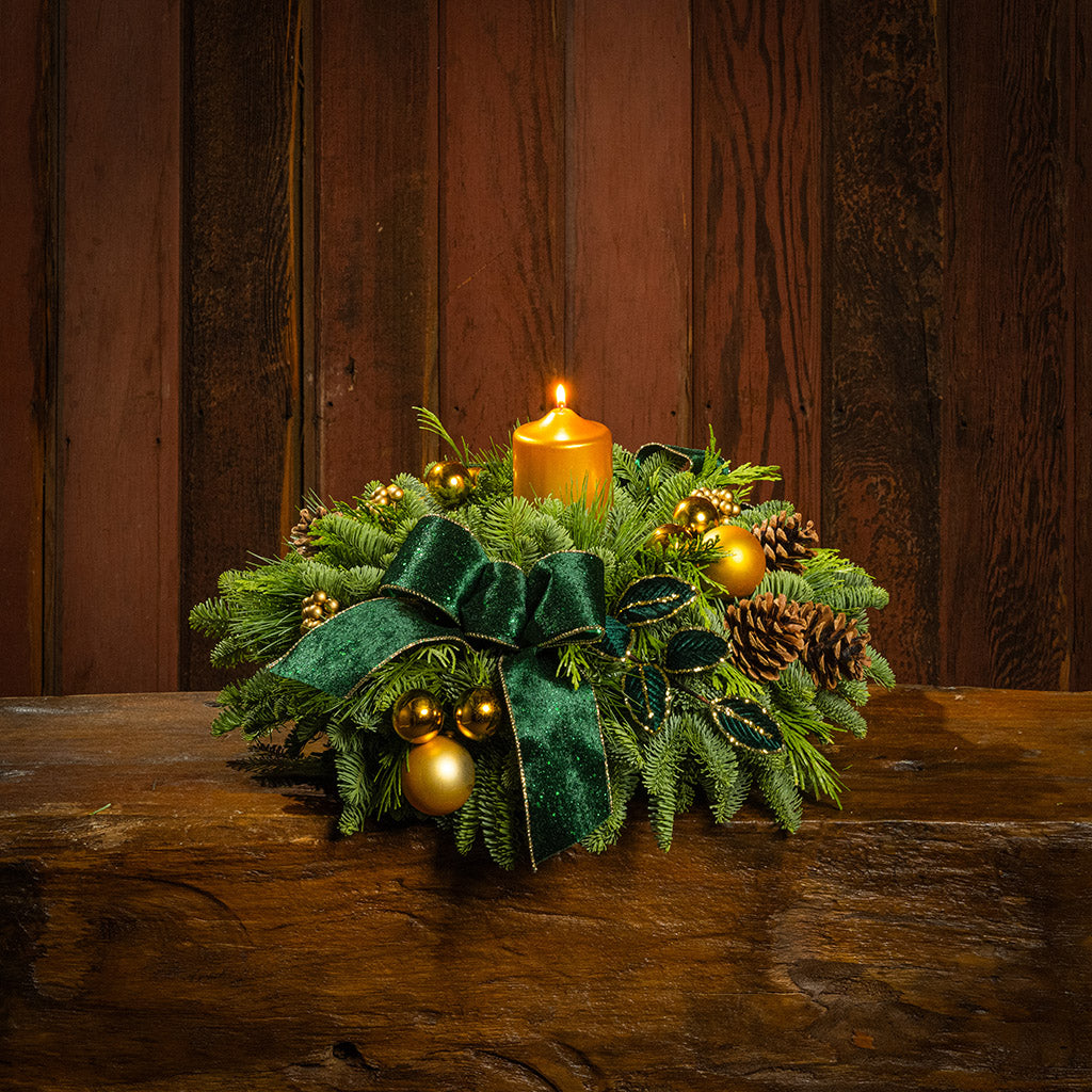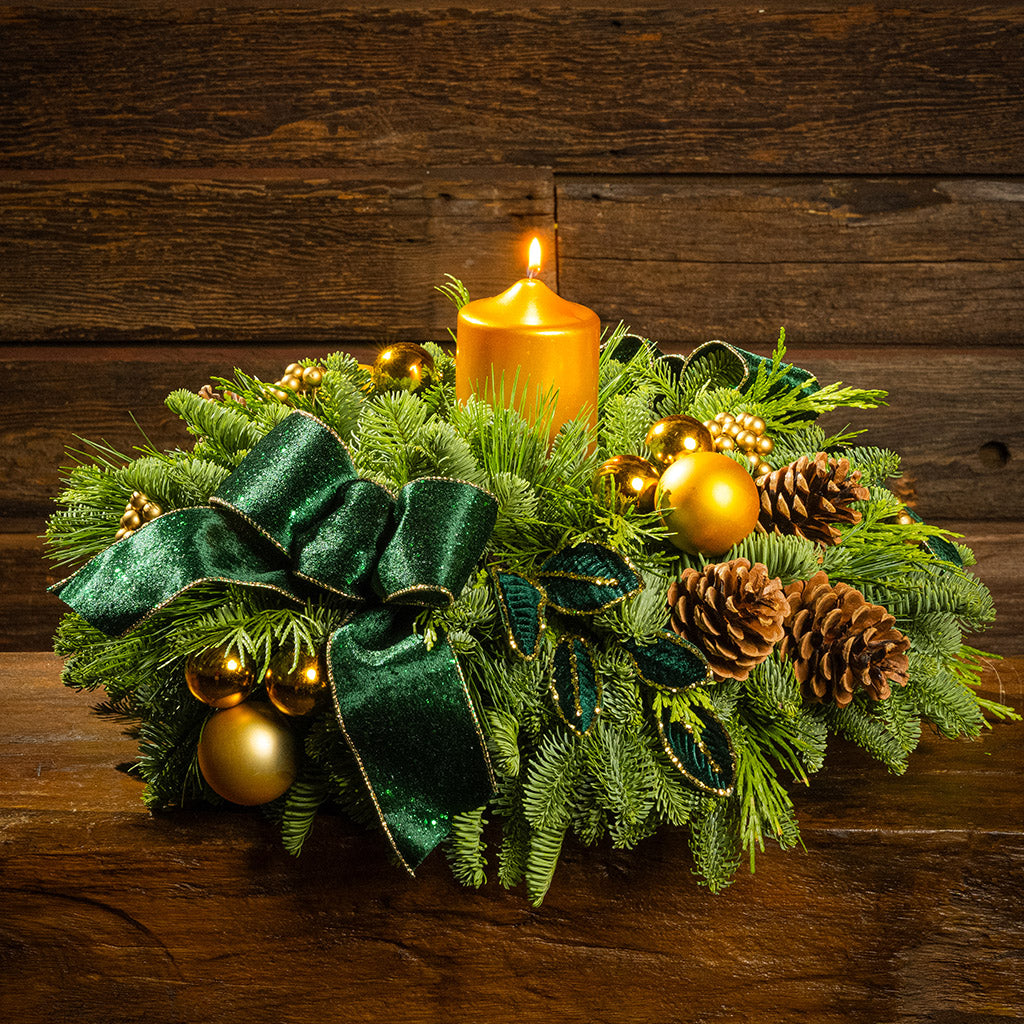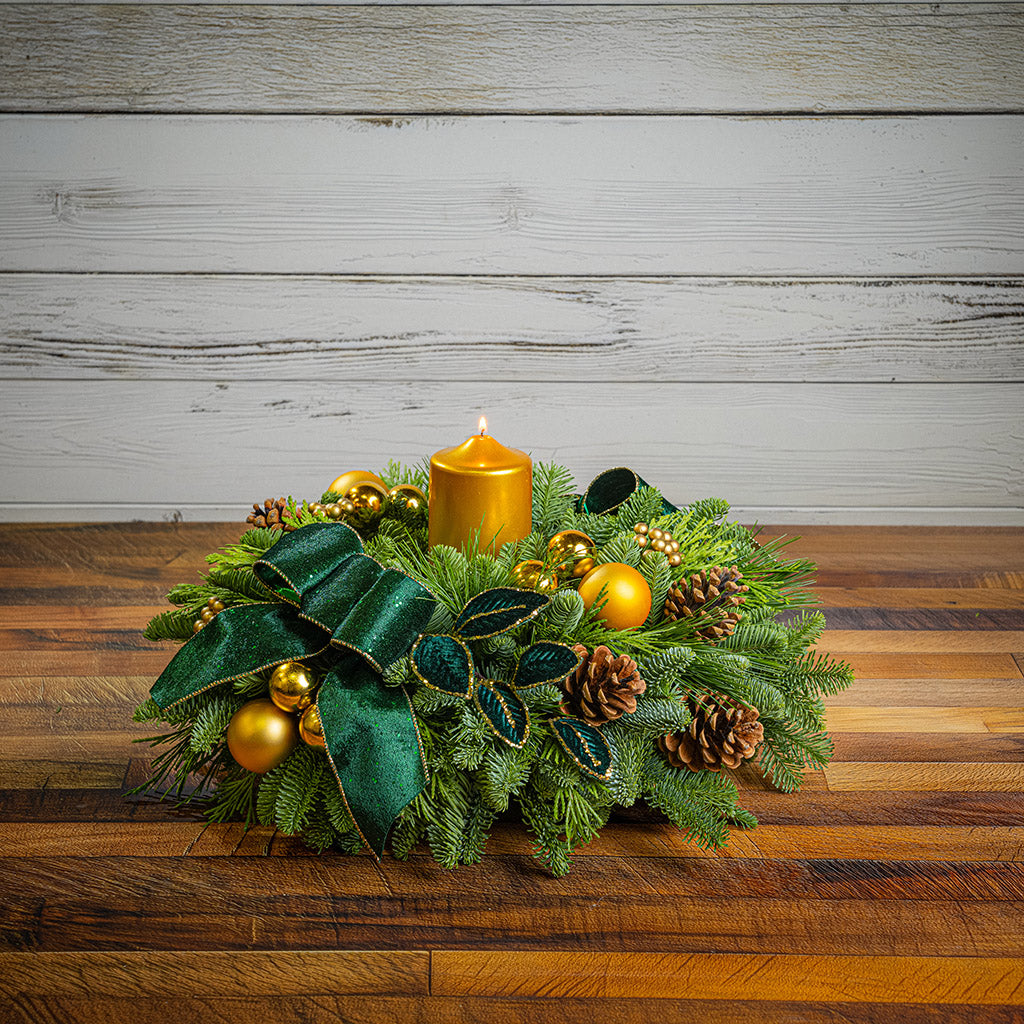 Make a stunning statement this season with the Emerald Opulence centerpiece, a showstopping arrangement that embodies timeless luxury and refined holiday charm. Regal without being overwhelming, this piece brings a timeless elegance to your celebrations, inviting admiration, conversation, and winter magic. Created with a base of lush noble fir, cedar, and pine that lasts for weeks, it features eye-catching gold accents of gold ball ornaments and a gilded metallic gold pillar candle. Amongst the greenery emerge opulent deep green velvet leaves ringed in gold, natural pinecones, and green-and-gold velvet bow tucks, catching the light and shimmering with enchantment. Whether you’re decorating for an elegant holiday soirée or simply want to elevate your home décor, Emerald Opulence delivers with presence and poise