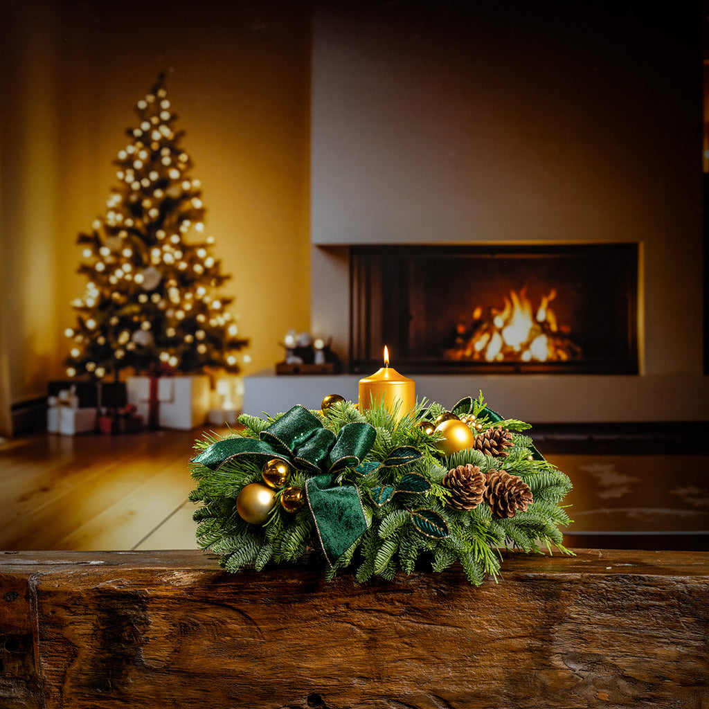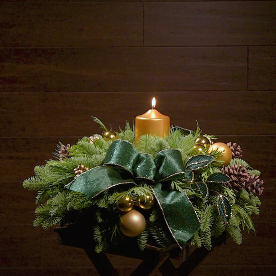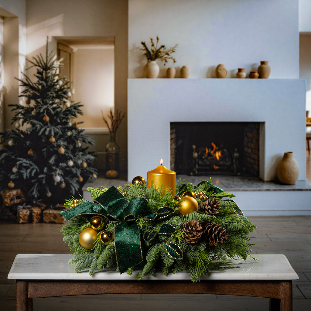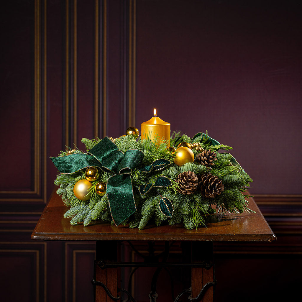 Make a stunning statement this season with the Emerald Opulence centerpiece, a showstopping arrangement that embodies timeless luxury and refined holiday charm. Regal without being overwhelming, this piece brings a timeless elegance to your celebrations, inviting admiration, conversation, and winter magic. Created with a base of lush noble fir, cedar, and pine that lasts for weeks, it features eye-catching gold accents of gold ball ornaments and a gilded metallic gold pillar candle. Amongst the greenery emerge opulent deep green velvet leaves ringed in gold, natural pinecones, and green-and-gold velvet bow tucks, catching the light and shimmering with enchantment. Whether you’re decorating for an elegant holiday soirée or simply want to elevate your home décor, Emerald Opulence delivers with presence and poise