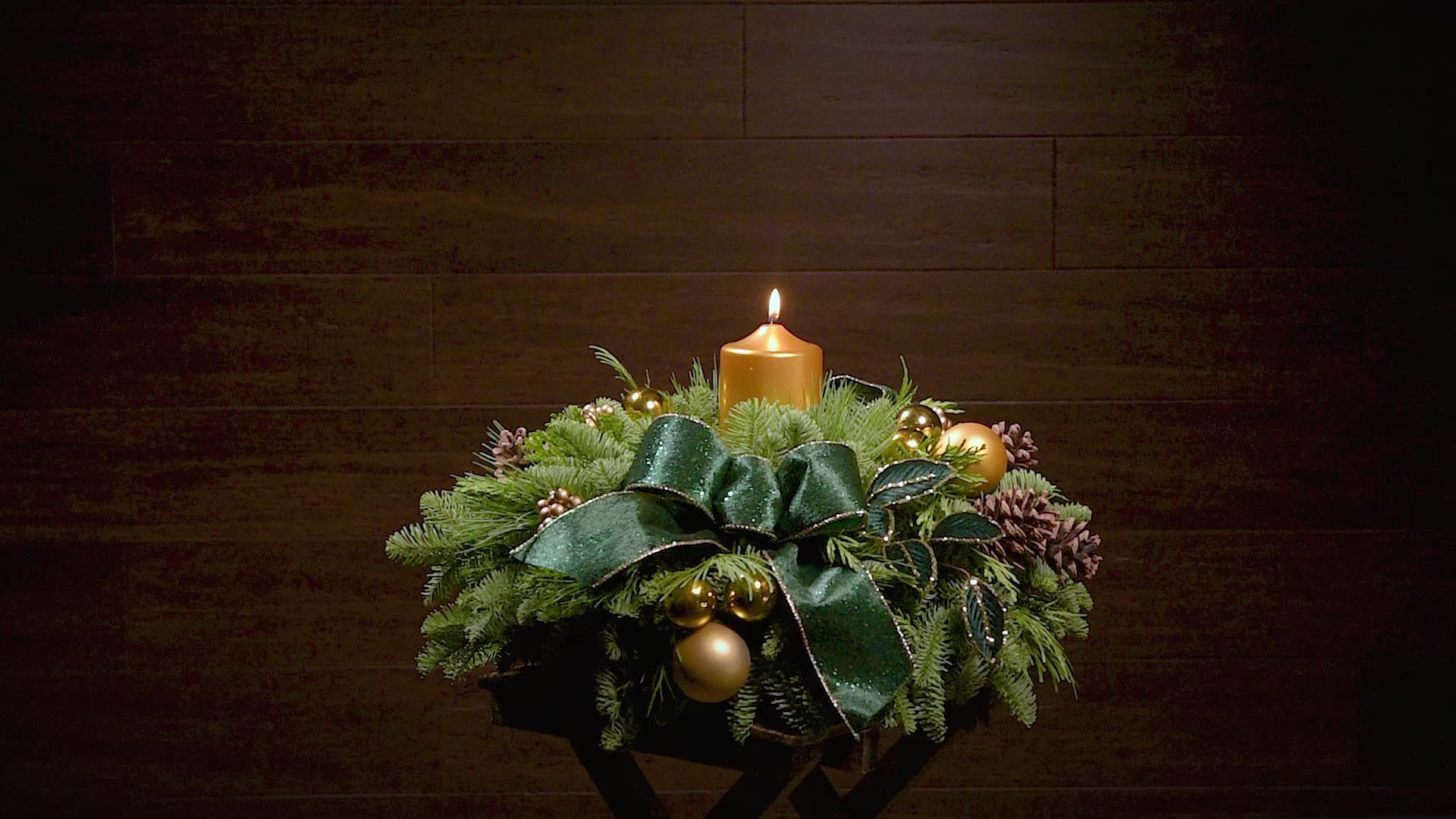 Materials: noble fir, cedar, and pine with gold ball ornaments, green and gold velvet leaves, natural pinecones, emerald and green velvet bow tucks, and a gold metallic pillar candle
