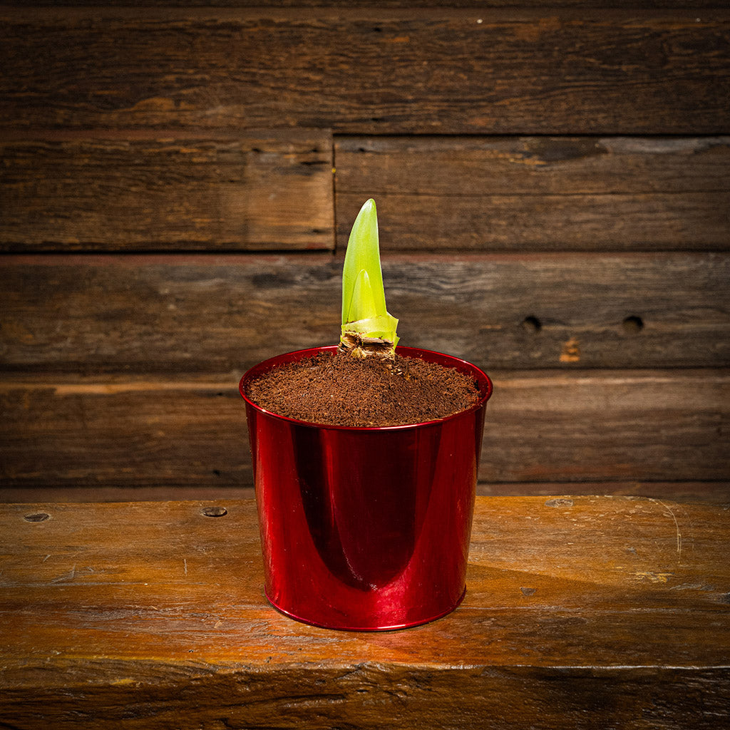 Materials: amaryllis bulb, soil discs, and a metallic red metal container