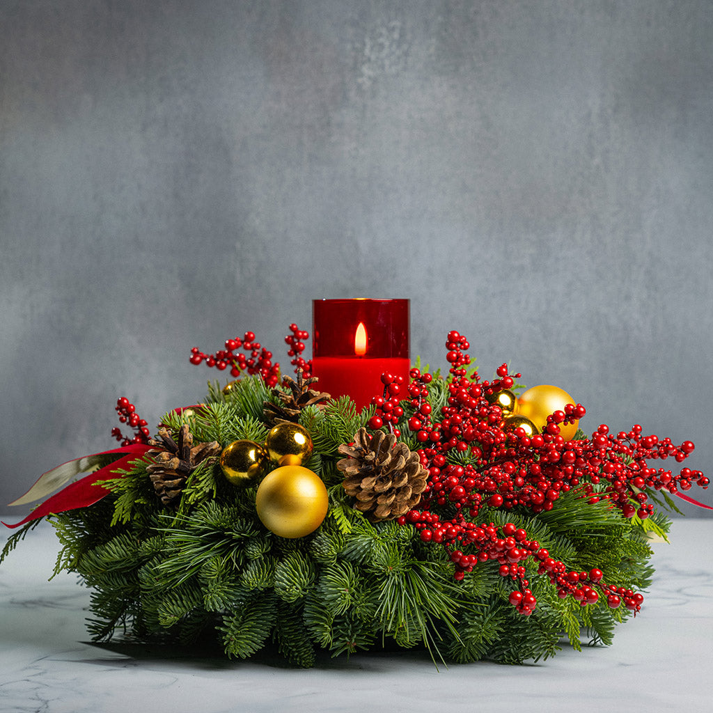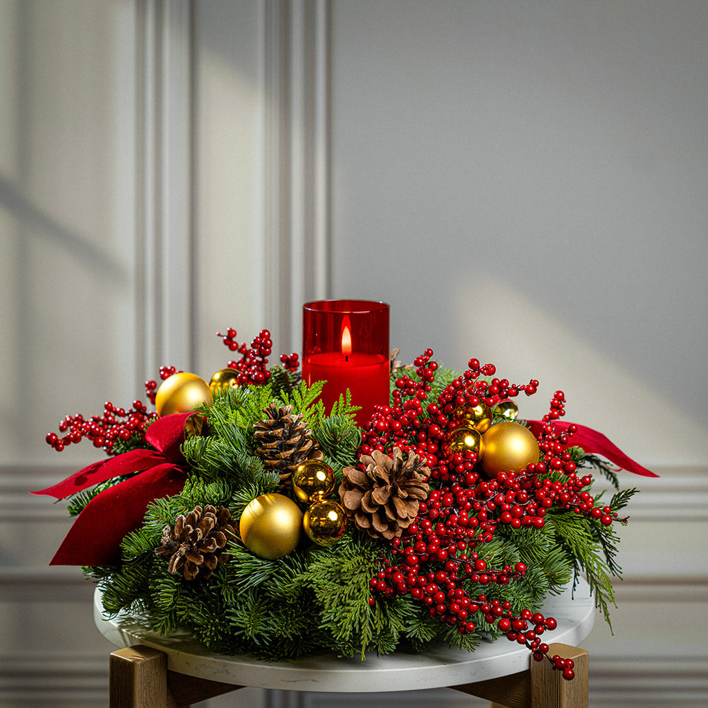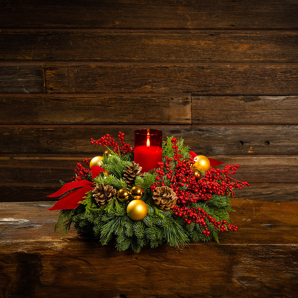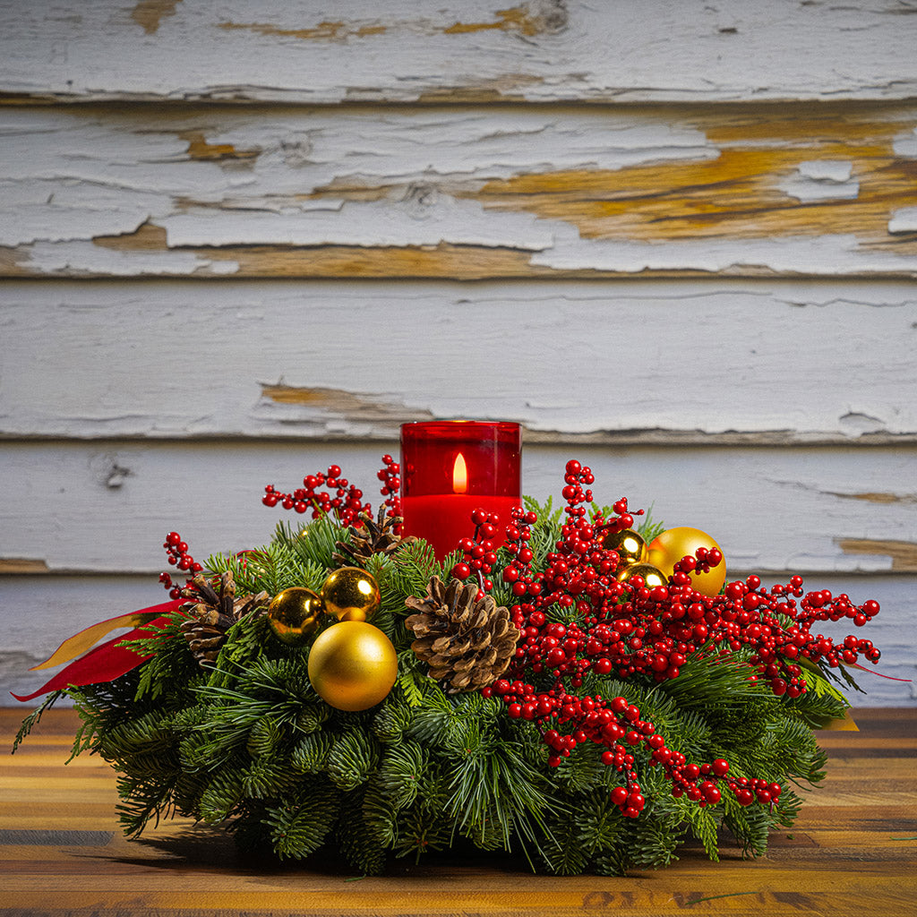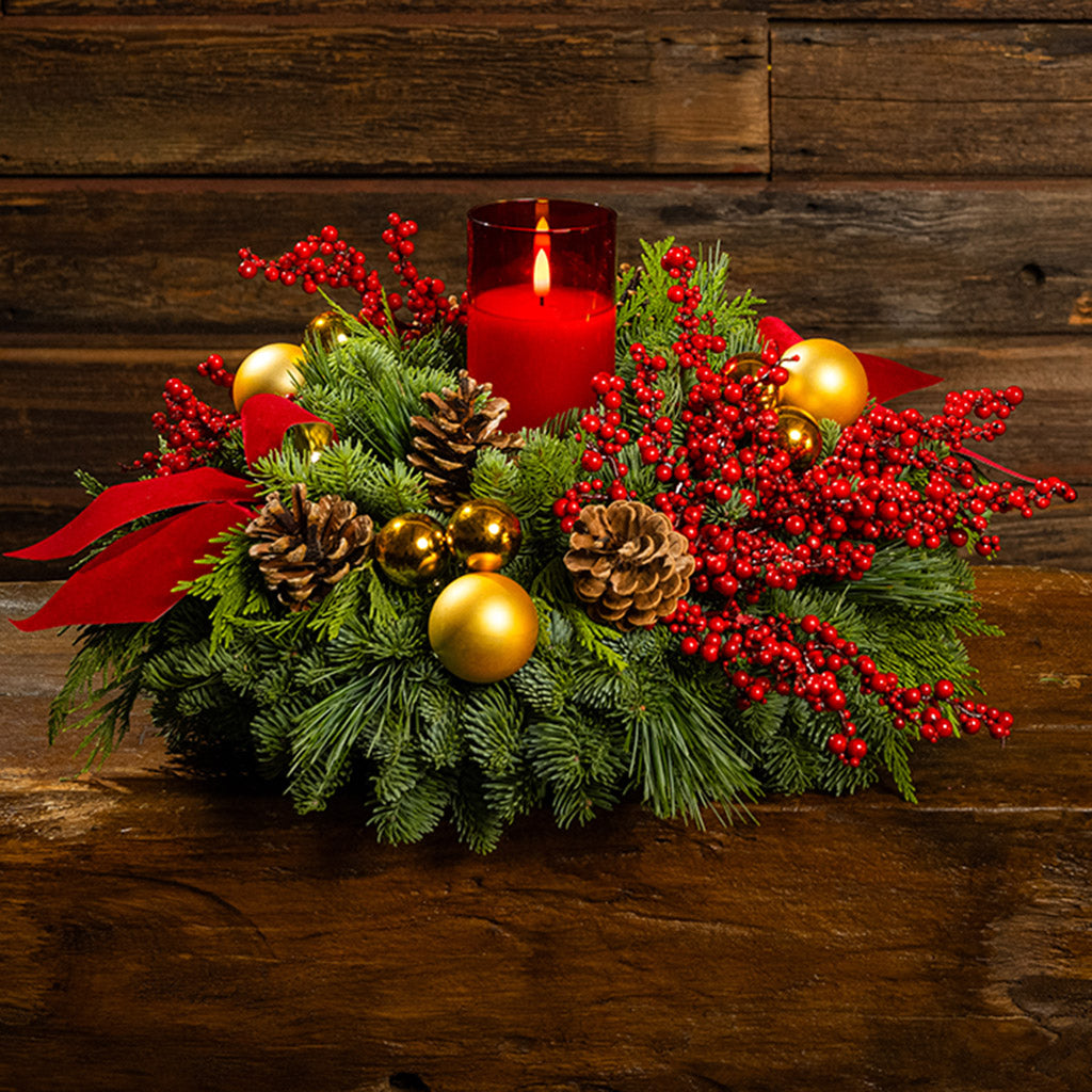 An alluring combination of rich reds, shimmering gold, and natural elements creates stunning holiday elegance in our grand Golden Pepperberry centerpiece! With timeless beauty and sophistication, it’s the perfect focal point for any holiday gathering or home. At its pinnacle, a radiant red LED candle casts a warm and gentle flickering glow. The lush base is handmade with noble fir, cedar, and pine and adorned with lustrous gold ball ornaments, branches of red berries, natural pinecones, and rich red velvet bows with gold backing. The gorgeous arrangement will ignite the spirit of Christmas with eye-catching beauty! This centerpiece measures approximately 18" across x 10” tall. The LED candle measures approximately 3” wide x 6” tall. It requires two AA batteries (batteries are not included).
