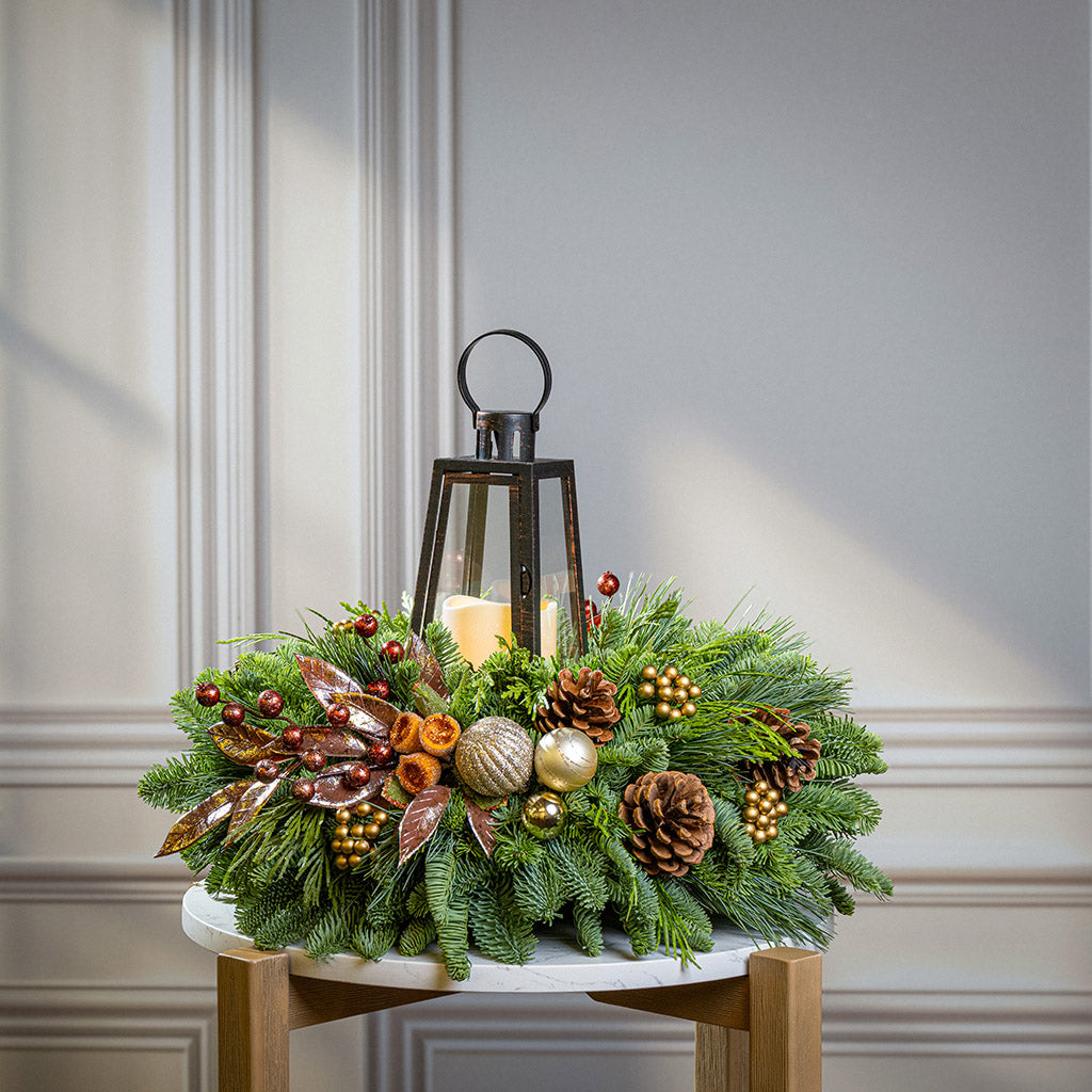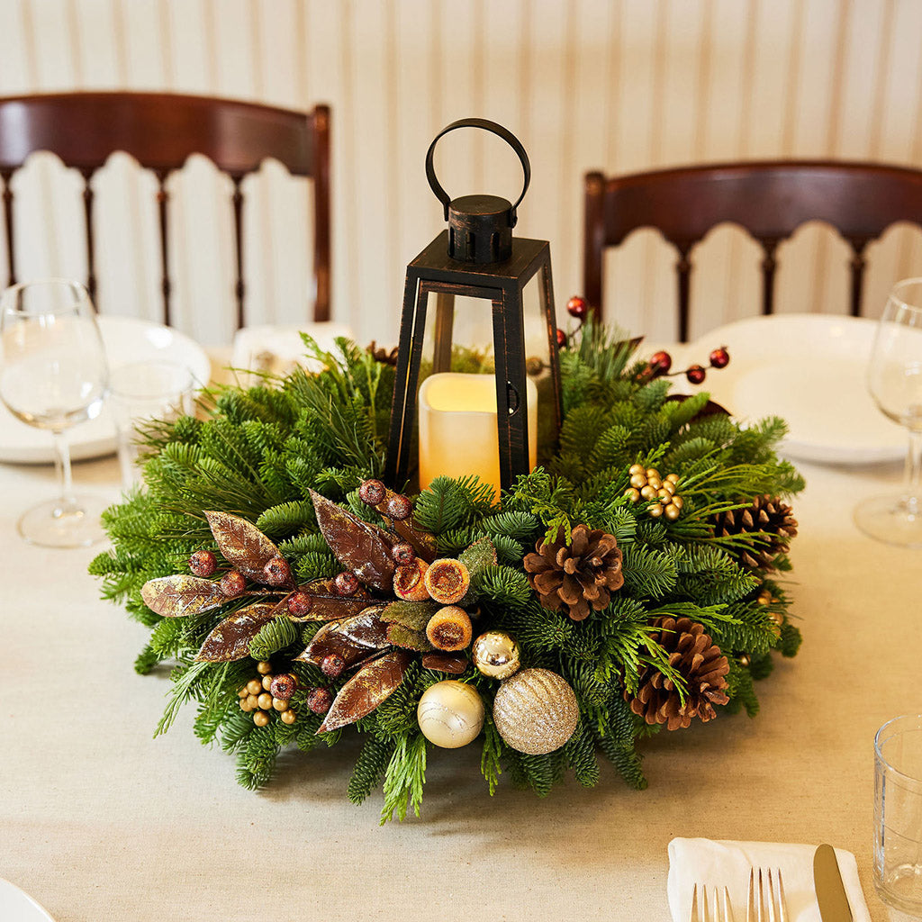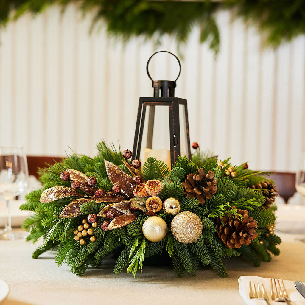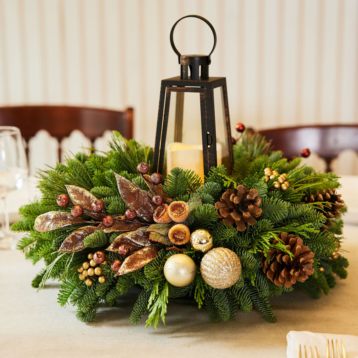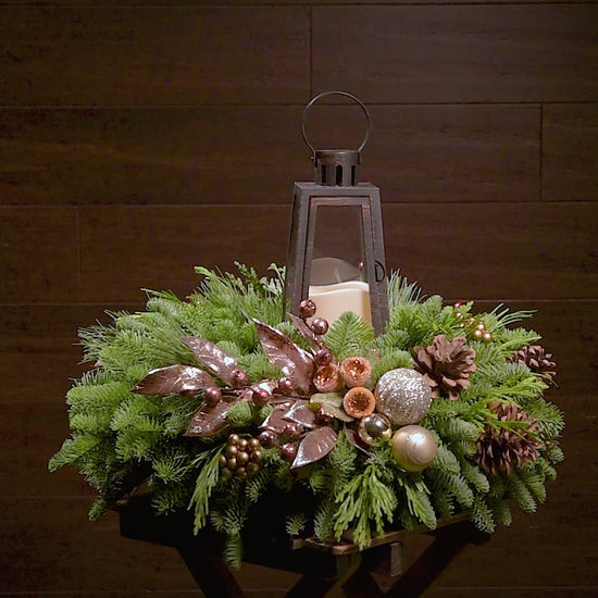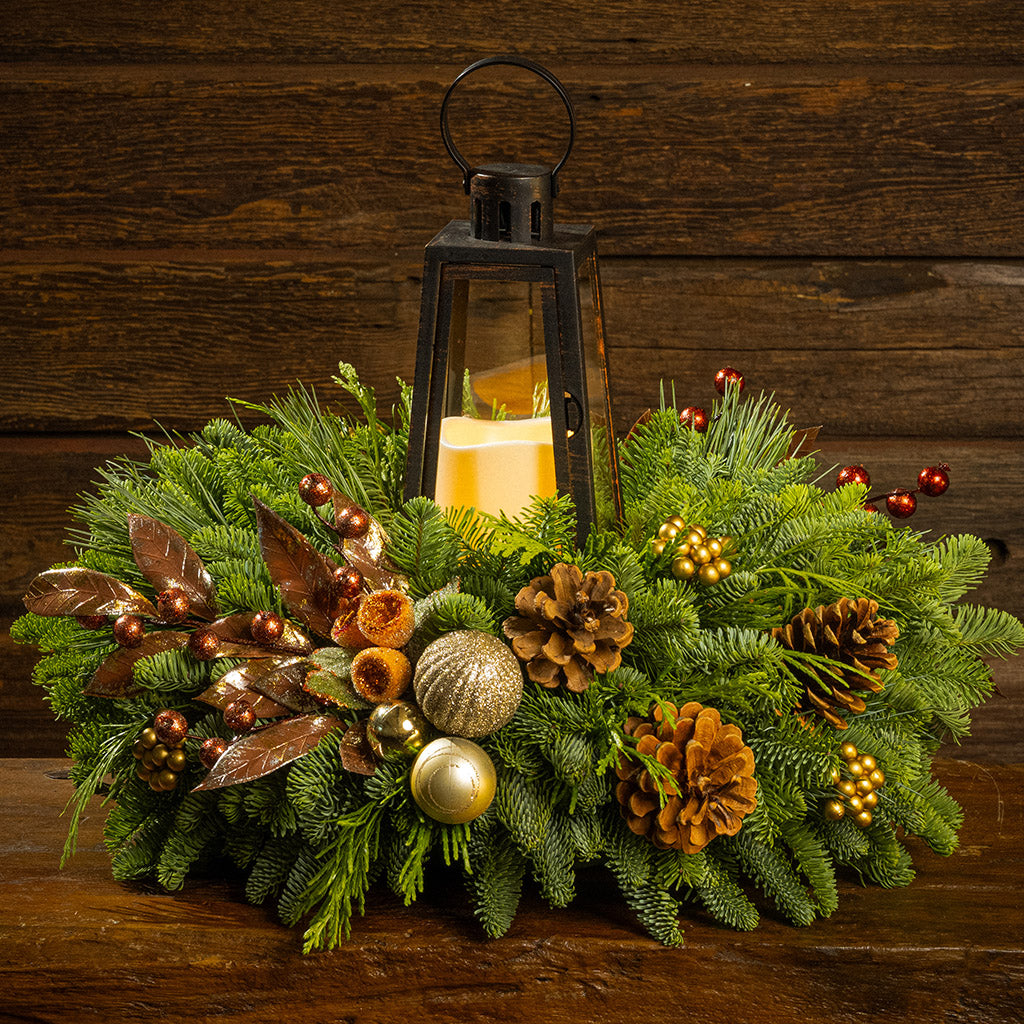 Capture the heart of the holidays with this cozy and refined centerpiece, Hearth & Home. Rustic with just the right amount of glamour, this centerpiece welcomes a festive sense of warmth with its woodland touches and abundance of elegance. Handcrafted with a fresh base of noble fir, cedar, and pine, we place radiant gold ball ornaments, graceful faux gold berries, and faux bronze berry branches amongst the lush greenery. Real pinecones add touches of nature. At the center lies an eye-catching brown metal lantern with a light up LED candle inside, casting a cheerful glow upon all who gather near. Hearth & Home is classic, heartfelt, and beautifully timeless – a showstopping gift for you and your loved ones.