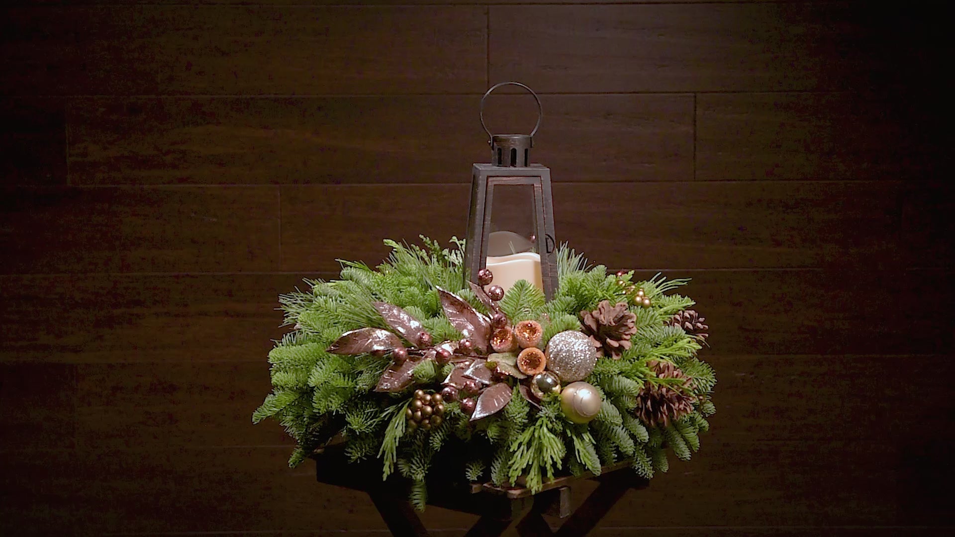 Materials: noble fir, cedar, and pine with gold ball ornaments, faux bronze berries and branches, faux gold berries, natural pinecones, and a brown metal LED lantern