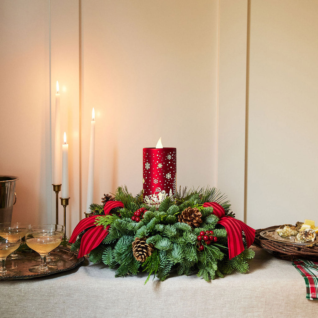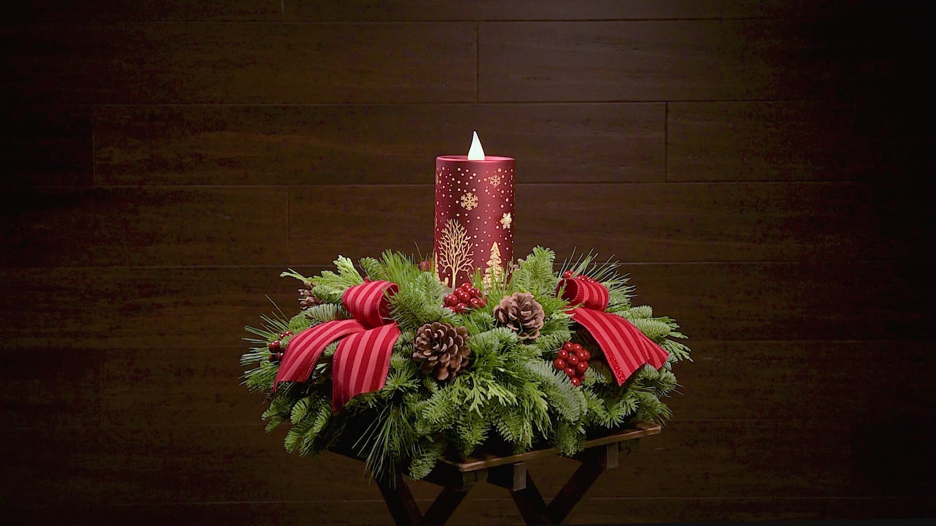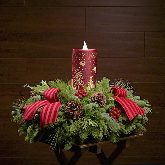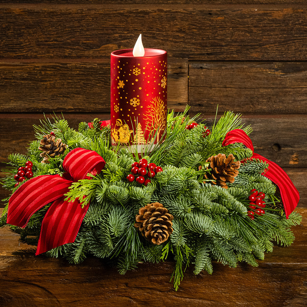 It's an extra-special, unforgettable Cyber Monday Special! Celebrate the season with this one-of-a-kind centerpiece that will turn heads! - and for only $59.95. That’s 44% off the full price! Our spectacular Here Comes Santa Claus centerpiece delivers in every way with a stunning red, spinning LED glass pillar candle etched with a delightful Christmas scene! The glass LED candle features a light-up flickering faux flame at its top while it spins, allowing light to shine through and illuminate a classic winter scene depicting a winter forest, Santa, and his reindeer. Resting in a bed of fresh noble fir, cedar, and pine, this centerpiece is artfully adorned with faux red berries, natural pinecones, and stunning red striped bow tucks. Perfect for families and to add cheer to any home, this fun and bright centerpiece delivers festive joy, inviting all to get into the Christmas spirit! The LED glass candle requires three AA batteries (not included). This centerpiece measures approximately 18" across x 10” tall.