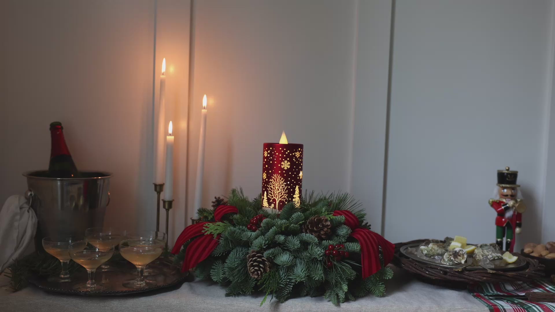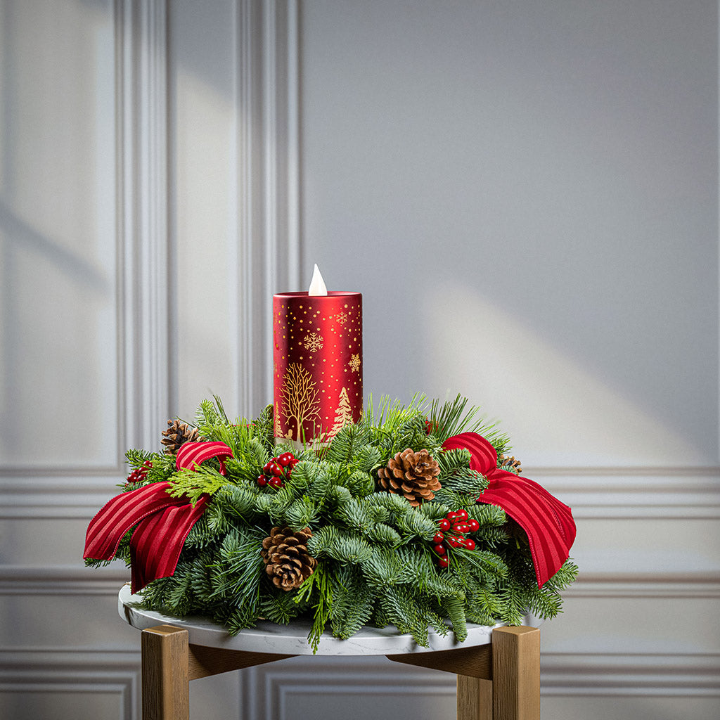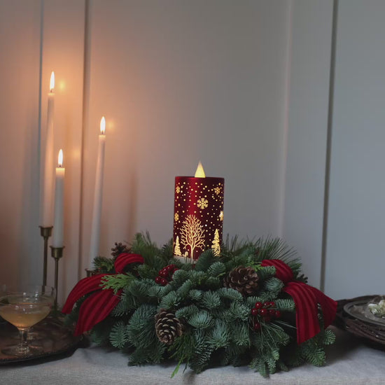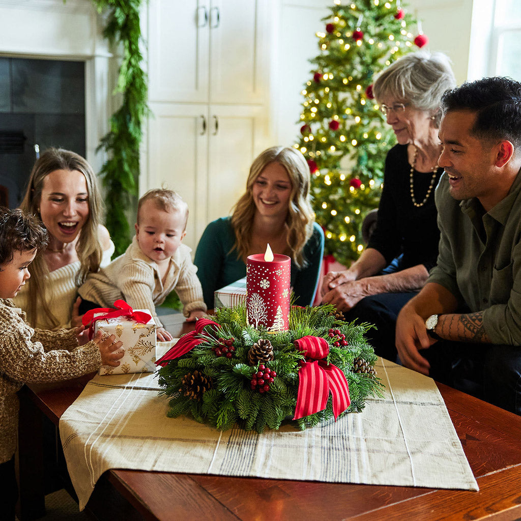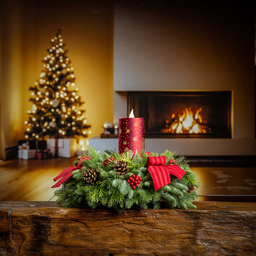 It's an extra-special, unforgettable Cyber Monday Special! Celebrate the season with this one-of-a-kind centerpiece that will turn heads! - and for only $59.95. That’s 44% off the full price! Our spectacular Here Comes Santa Claus centerpiece delivers in every way with a stunning red, spinning LED glass pillar candle etched with a delightful Christmas scene! The glass LED candle features a light-up flickering faux flame at its top while it spins, allowing light to shine through and illuminate a classic winter scene depicting a winter forest, Santa, and his reindeer. Resting in a bed of fresh noble fir, cedar, and pine, this centerpiece is artfully adorned with faux red berries, natural pinecones, and stunning red striped bow tucks. Perfect for families and to add cheer to any home, this fun and bright centerpiece delivers festive joy, inviting all to get into the Christmas spirit! The LED glass candle requires three AA batteries (not included). This centerpiece measures approximately 18" across x 10” tall.
