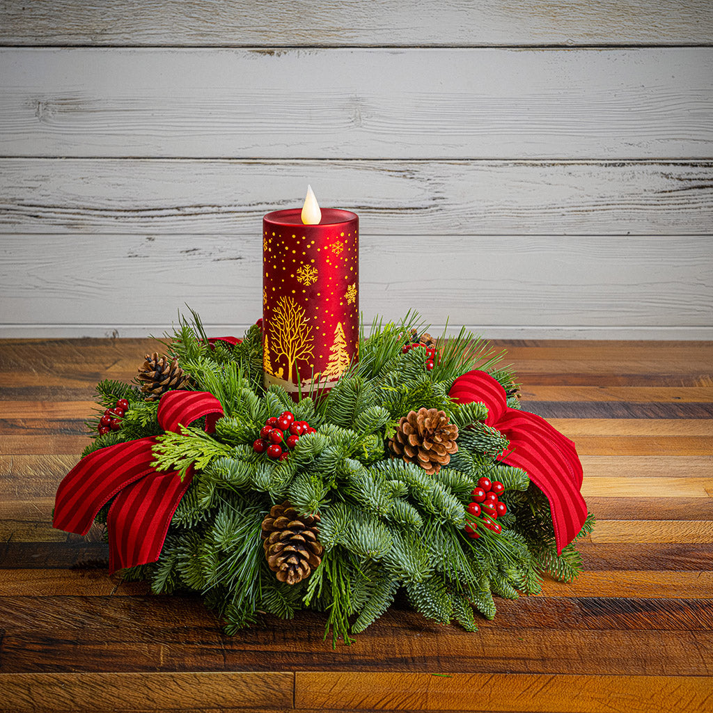 Materials: noble fir, cedar, and pine with red faux berries, natural pinecones, red striped bow tucks, and a decorated red LED spinning glass candle
