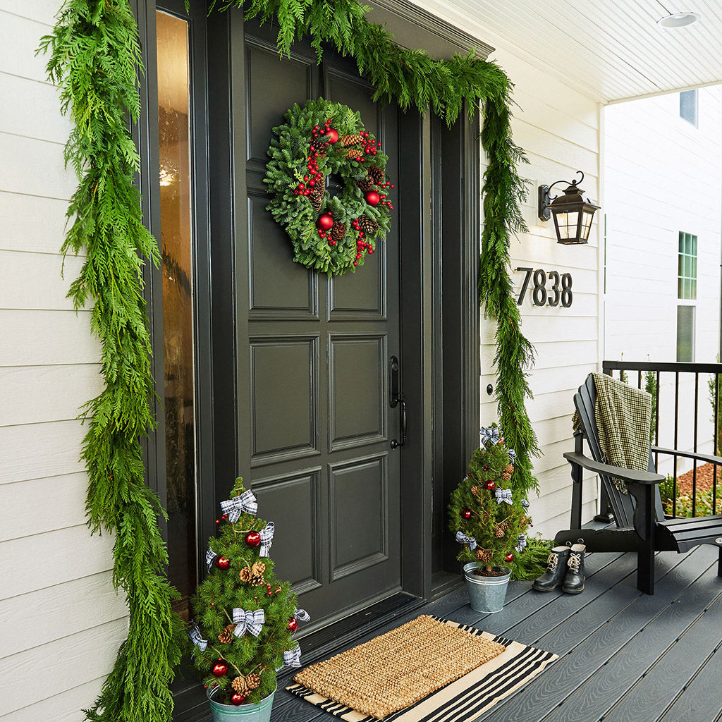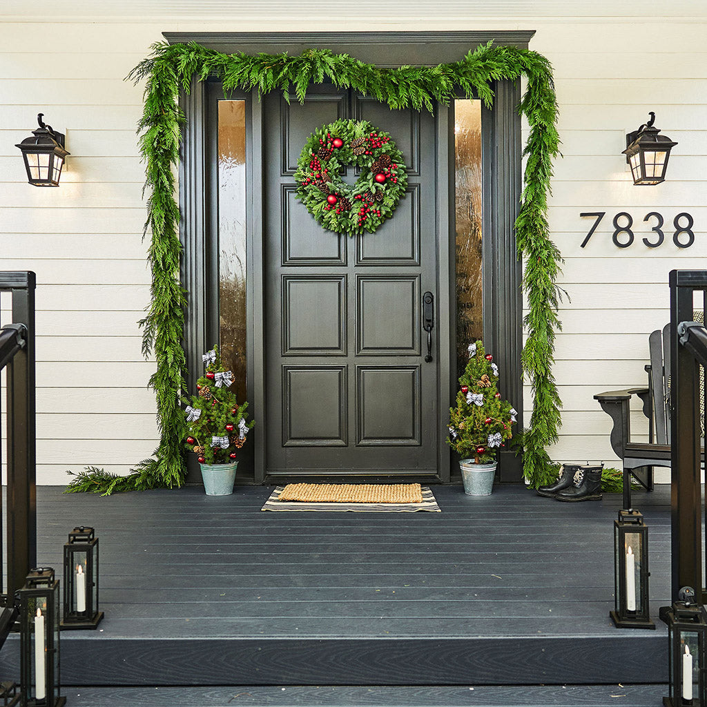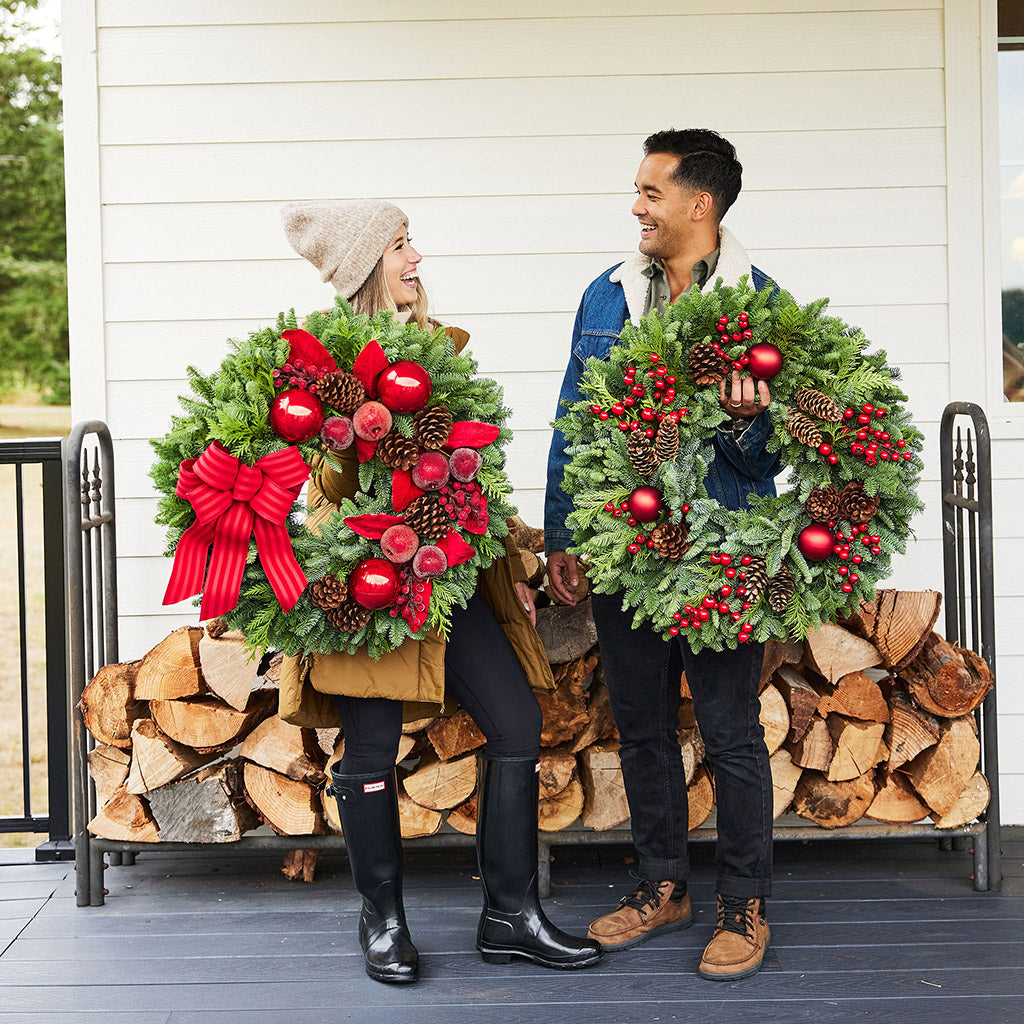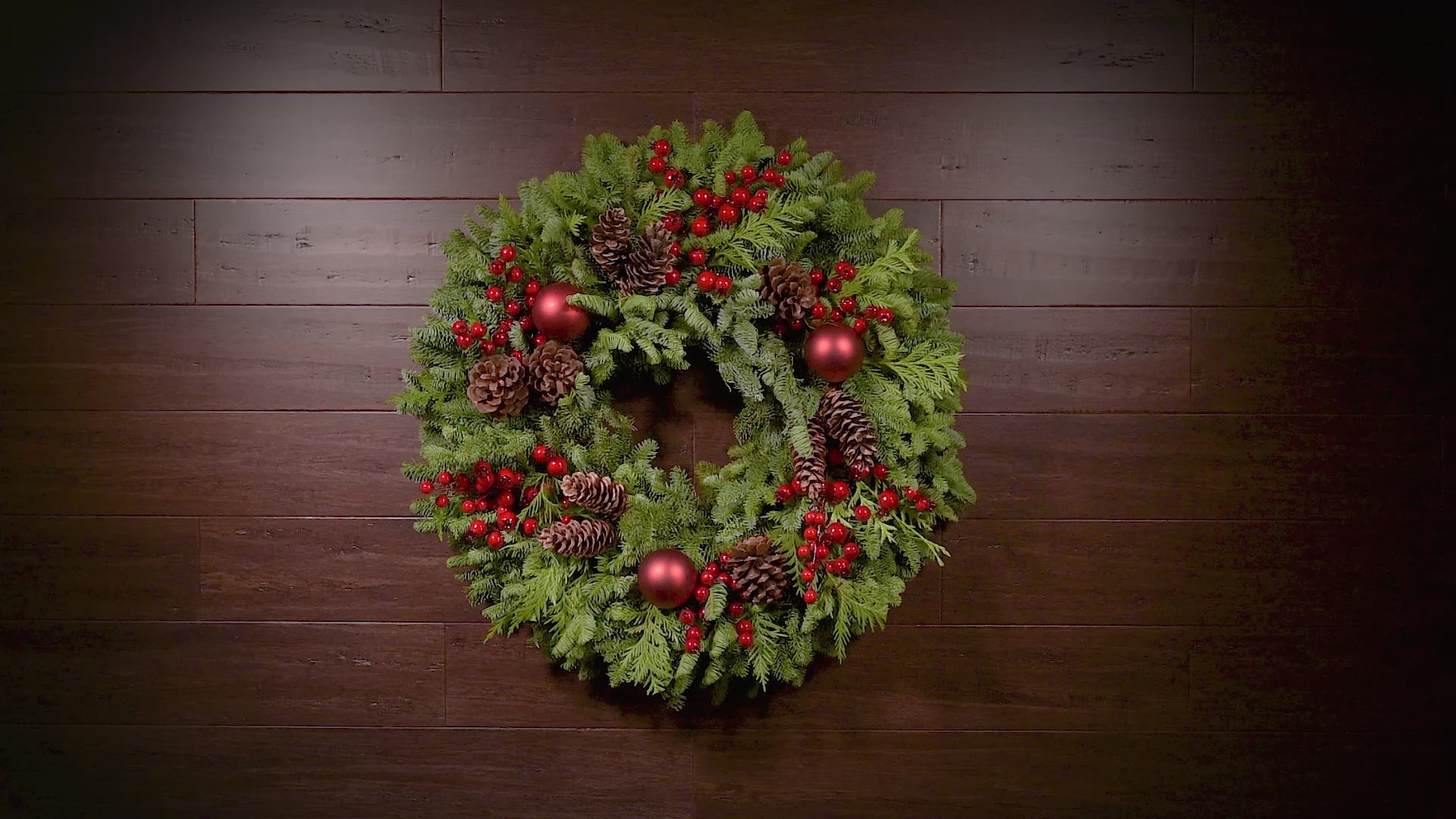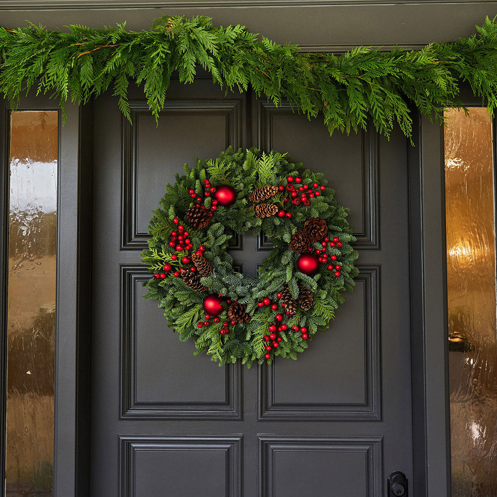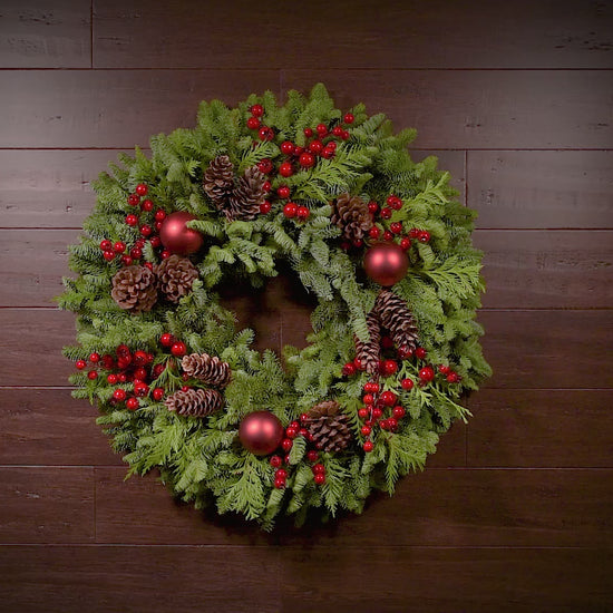 Embrace the natural side of the holidays with the grand and vibrant Midwinter Wishes wreath. Designed without a bow, its simple beauty shines through, making you feel as though you are on your way to a cozy winter cabin. This wreath begins with a handcrafted base of fresh noble fir and cedar, adorned with dazzling red faux berries, stunning red ball ornaments, and large real pinecones. The contrasting woodsy textures and vibrant color make it both subtle and an excellent statement piece. Perfect for those who love holiday decor without the frills, Midwinter Wishes is sure to bring timeless festive cheer to all around!