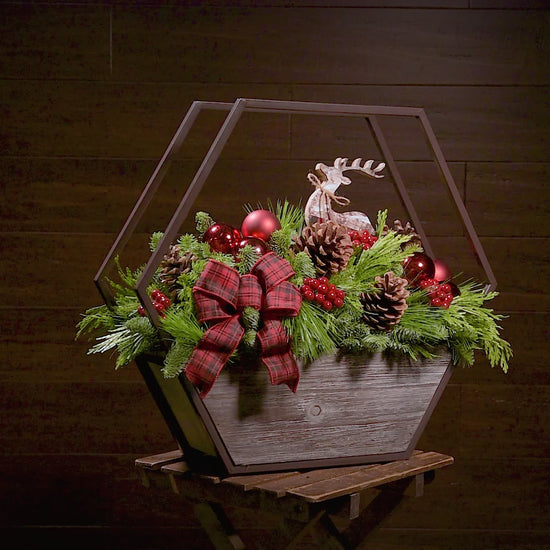 Step into a beautiful winter woodland with Mountain Reindeer, a festive centerpiece that feels like it came straight from a snowy mountain cabin! It’s hand-assembled with a base of noble fir, cedar, and pine and accented with natural pinecones, red ball ornaments, and faux red berries to capture the essence of a rustic holiday. A red-and-green plaid bow adds a pop of color, calling to mind flannel blankets, forest walks, and evenings by the fire. Finished off with a charming white wooden deer ornament, all in a hexagonal metal and wooden container, Mountain Reindeer makes a perfect gift for those who love the warmth of a cozy mountain cabin and appreciate winter’s meaningful moments.