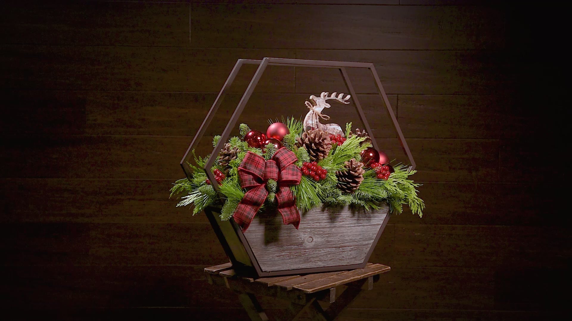 Materials: noble fir, cedar, and pine with red ball ornaments, faux red berries, natural pinecones, a red-and-green plaid bow, and a wooden deer decoration, in a metal and wood container