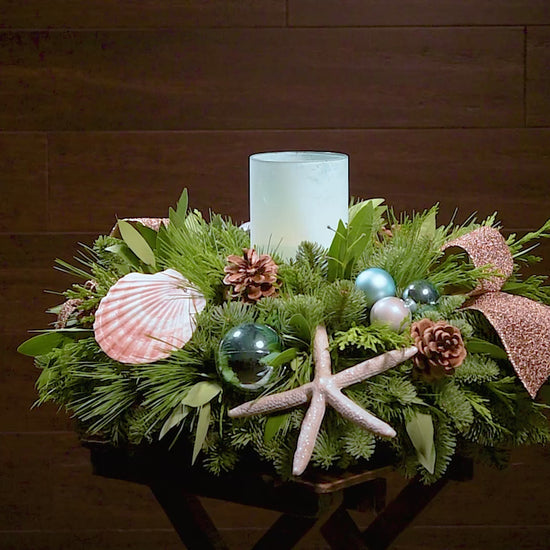 Bring the seaside to you or your friends this holiday season with this coastal, beach-themed holiday evergreen centerpiece. Its blue and ivory hues are perfect for Christmas, Hanukkah, New Year, or as every day decor to carry you through the season! Fresh noble fir, pine, cedar, and bay leaves create the base, accented with real seashells, faux seastars, light blue and aqua ball ornaments, real pinecones, and shimmering bronze bow tucks reminiscent of soft sand. At the center is a glowing blue frosted glass LED candle, ready to shine light on your holiday celebrations that bring back fond memories of the beach!