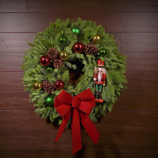 March into Christmas with our joyful Nutcracker Noel wreath, bursting with color and festive fun! Centered around a delightful red nutcracker figurine that is standing guard, this wreath is straight out of a storybook! A fragrant base of fresh noble fir and pine is artfully assembled, incorporating stunning red, green, and gold ball ornaments that add a playful touch. Real pinecones and a bright red velvet bow finish off this design, embracing the celebration of holiday joy, tradition, and imagination. This wreath will spread smiles and spark nostalgia! Whether welcoming guests or decorating your favorite holiday corner, Nutcracker Noel is a showstopper full of seasonal sparkle. The red nutcracker itself is made of wood and measures approximately 3” wide x 2.75” deep x 9.5” tall.
