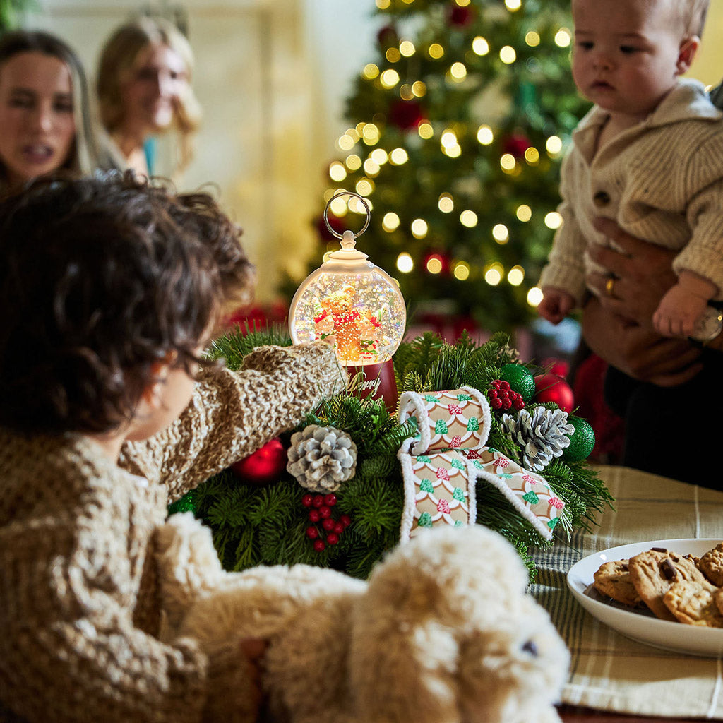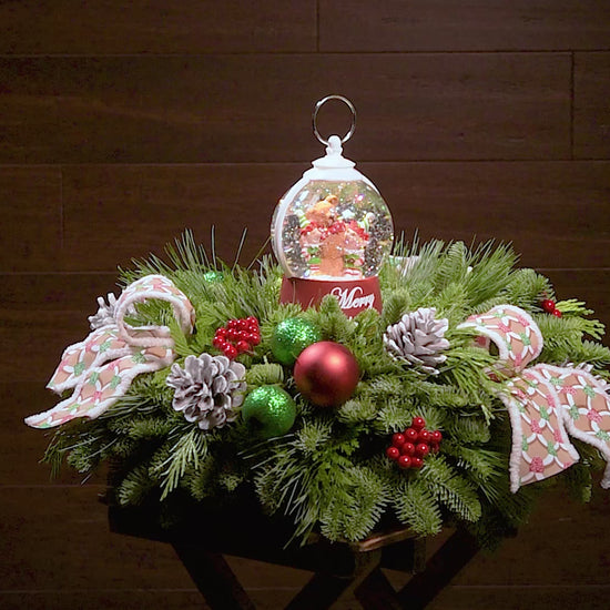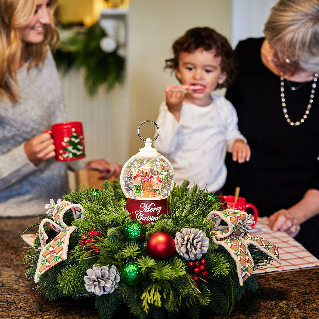 The holidays just got a whole lot cuter! Meet Polar Pals, the perfect centerpiece to brighten little faces with big smiles! The centerpiece is hand-assembled with fresh-cut noble fir, cedar, and pine. At the center is the real showstopper – a stunning water globe featuring two North Pole elves and a cute bear together in a cozy hug with the words “Merry Christmas” on the base. Give it a gentle shake and watch the sparkles swirl around! Nestled within the greenery are glittery red-and-green ball ornaments, faux red berries, and frosted pinecones that bring playful Christmas cheer. Adorable bow tucks are added, bearing red and green gingerbread house patterns that transport you into a sweet candy wonderland! It’s the perfect gift for families, grandchildren, or anyone looking for a little extra fun this season!