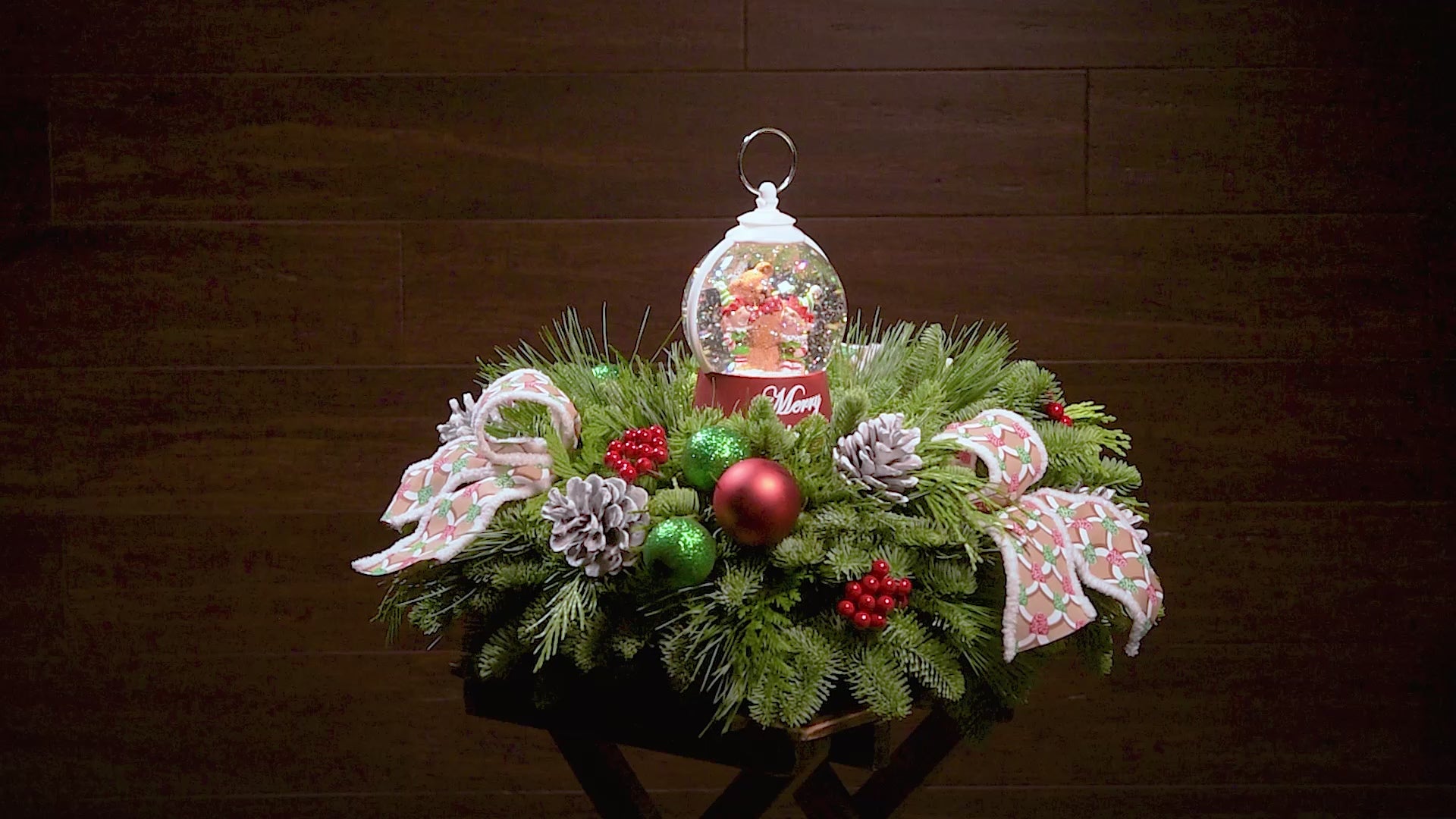 Materials: noble fir, cedar, and pine with green-and-red glittery ball ornaments, frosted pinecones, faux red berries, pink-and-green gumdrop-themed bow tucks, and a red holiday-themed water globe