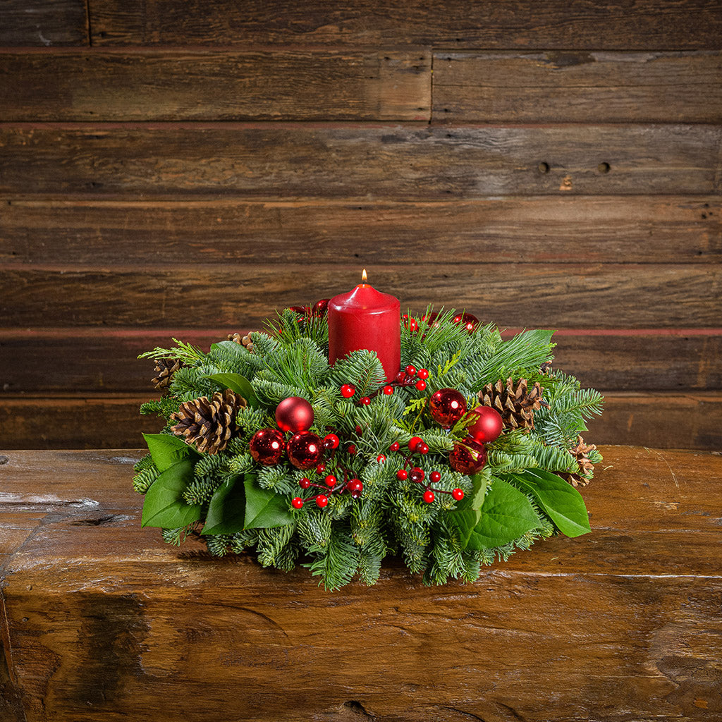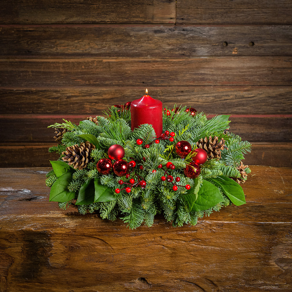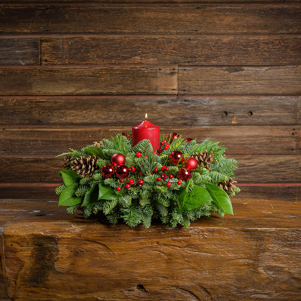 Our new Quiet Gatherings Centerpiece & Lights Special is gorgeous and wonderfully priced at $59.95! With timeless beauty, this arrangement captures the essence of the season perfectly and is 33% off the full price! We include a set of dual-action LED lights. A graceful red pillar candle casts a warm holiday glow and brightens any home. It sits on a lush and fragrant bed of fresh noble fir, cedar, pine, and lustrous oval salal leaves and is accented with shiny red ball ornaments, plenty of red berries, and natural pinecones. The result is a masterpiece that will add warmth and elegance to any gathering or home and make an unforgettable gift. This centerpiece measures approximately 18" across x 10” tall.