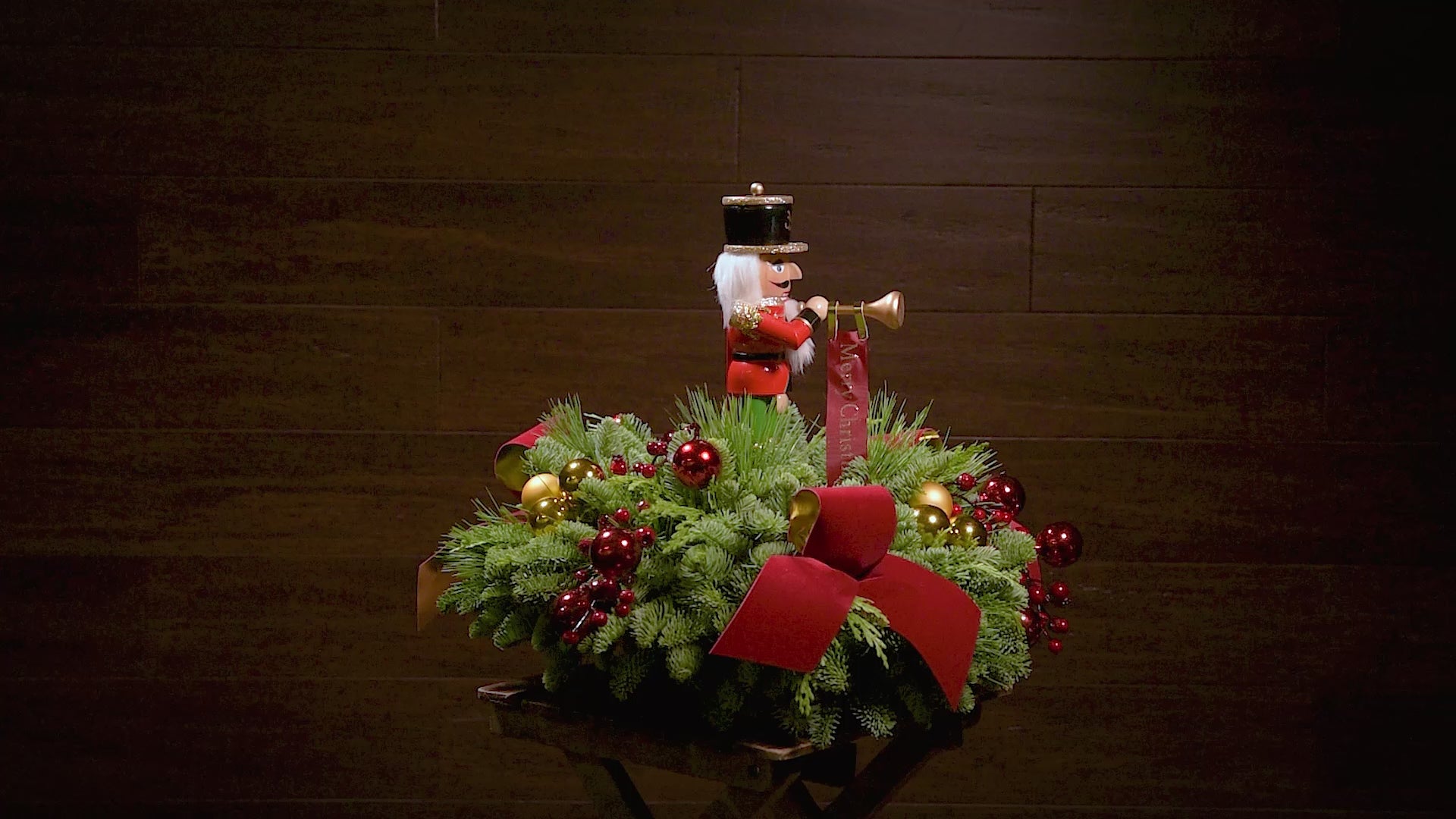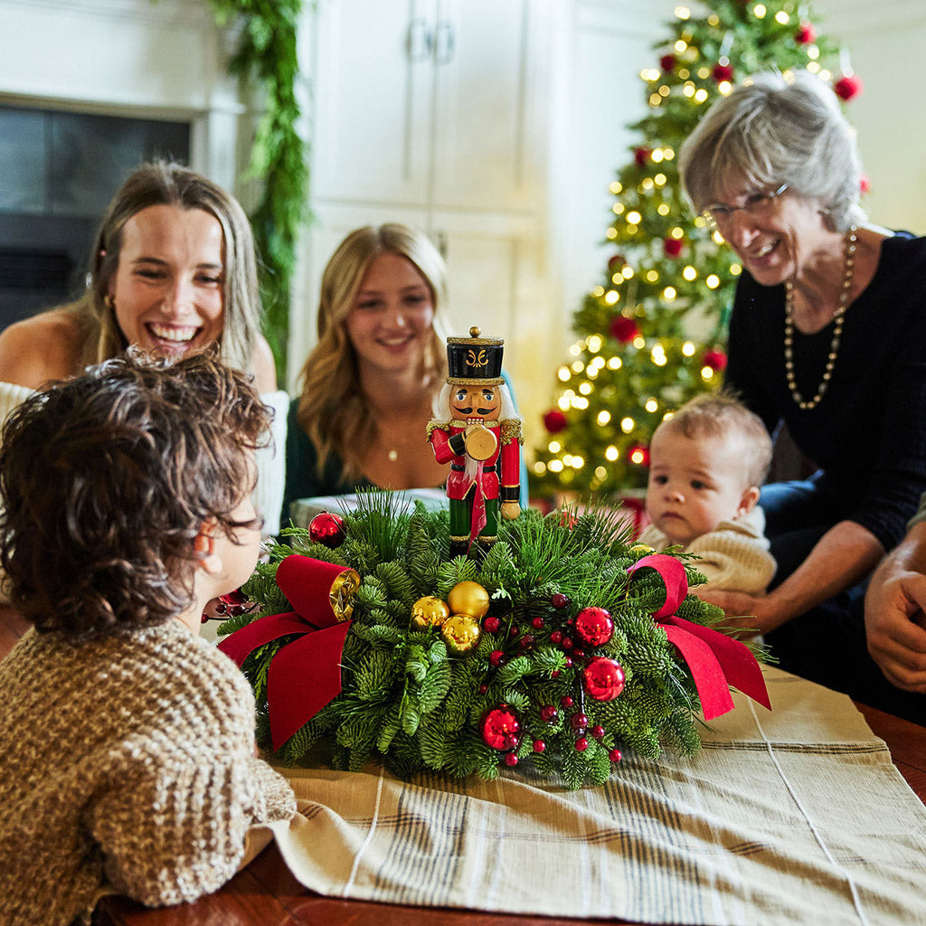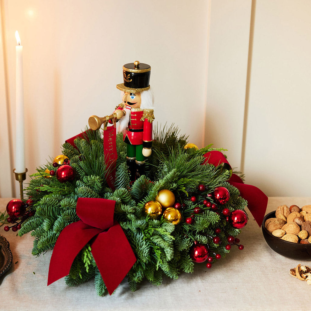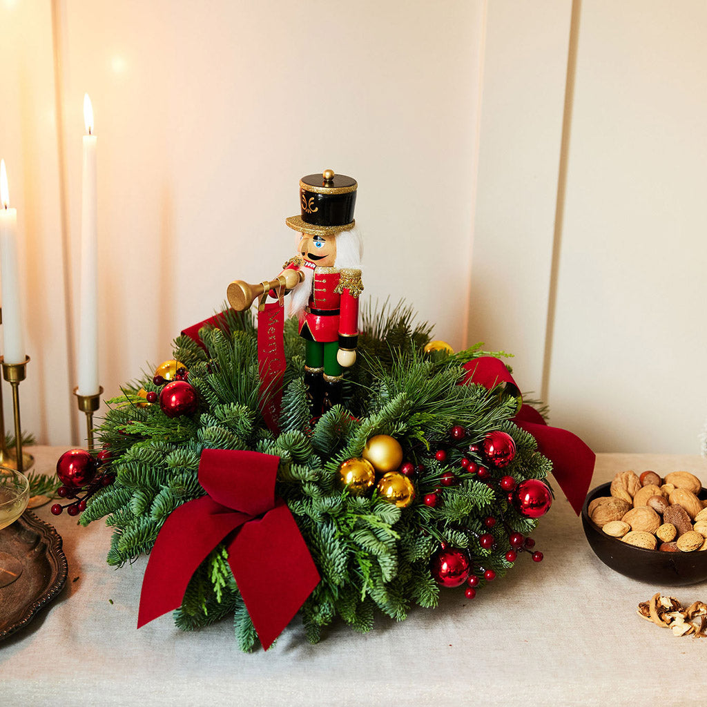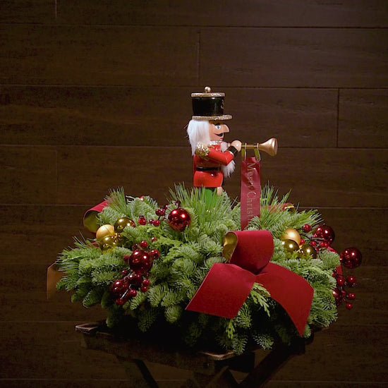 Immerse yourself in the holiday season with this extraordinary centerpiece as a captivating wooden nutcracker takes center stage! Nutcrackers are a symbol steeped in tradition, beckoning us to embrace cheerful festivities while transporting us to a world where snowflakes dance and dreams take flight! On our stunning Regal Bugler centerpiece, an authentic bugler nutcracker stands tall, nestled amidst a mix of fresh noble fir, cedar, and pine. He holds a gold bugle with a flag that reads “Merry Christmas” (the flag is removable).The greenery is beautifully accented with shiny gold ball ornaments, red ball ornaments, faux red berry branches, and red velveteen bows. This elegant arrangement will bring delight to all who behold its detail and grandeur. Whether you add the nutcracker to your collection or start a new holiday tradition, it’s sure to deliver lots of joy!