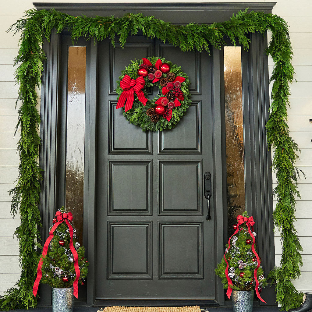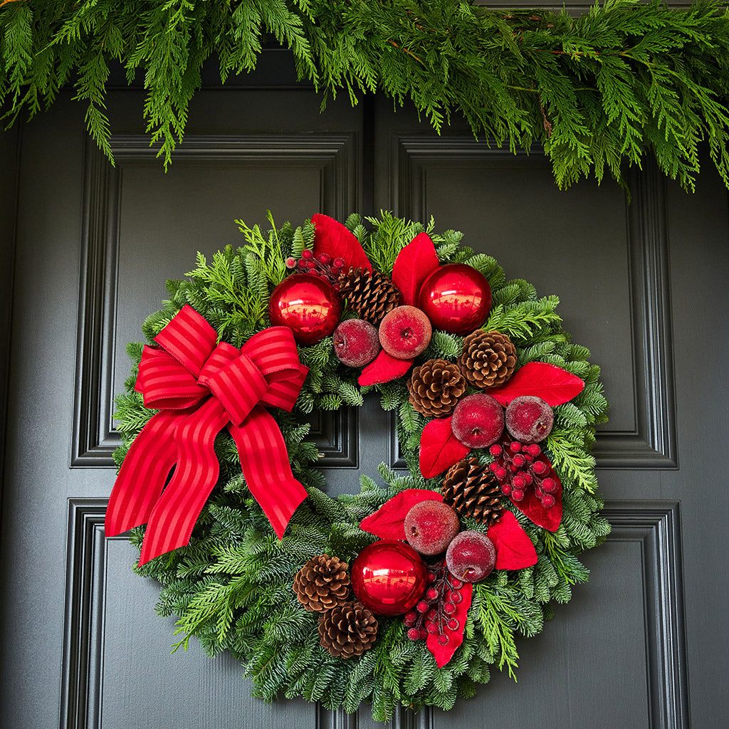 Materials: noble fir and cedar with frosted faux apples and berries, red velvet leaves, large red ball ornaments, natural pinecones, and a red striped bow