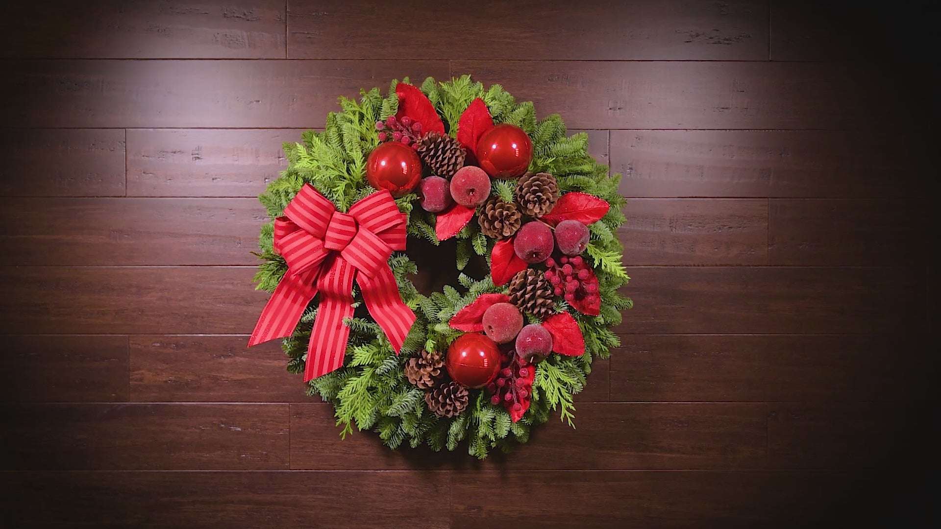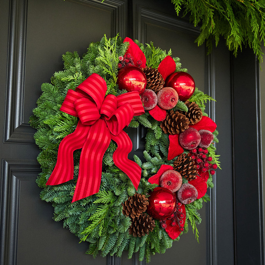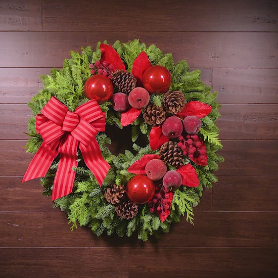 Revel in the splendor of the season with our Royal Harvest wreath, a regal statement piece that represents the rich red grandeur of the classic holiday! A lush bed of fresh noble fir and cedar is artfully decorated with frosted faux apples and berries, evoking the beauty of a festive banquet. Red glossy ball ornaments, real pinecones, and a show-stopping red striped bow finish off this wreath with a majestic flourish and touch of sophistication. Whether you're hosting a holiday gathering or dressing your door, this wreath is a bold, beautiful way to celebrate.