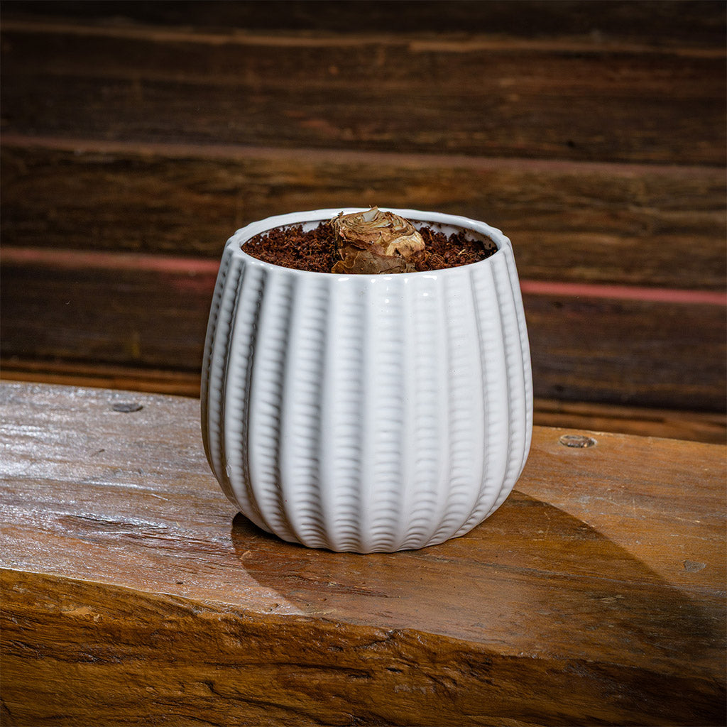 Materials: an amaryllis bulb potted in soil in a white ceramic container