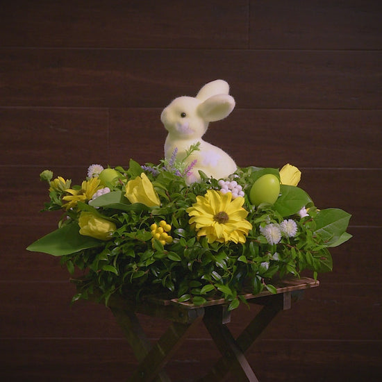 Full of fun and joy, our Sunny Bunny centerpiece will delight recipients of any age! A sweet, charming yellow bunny sits gently atop a bed of fresh salal and green huckleberry. The lush greenery forms the base of this bright, playful arrangement, along with faux yellow daisies and tulips, yellow and white berries, and faux light-green eggs that evoke a cheerful, sunny mood. This vibrant centerpiece is perfect for Easter, birthdays, get-well wishes, and bringing the joy of spring to any home! This centerpiece measures approximately 16” across x 9” tall.