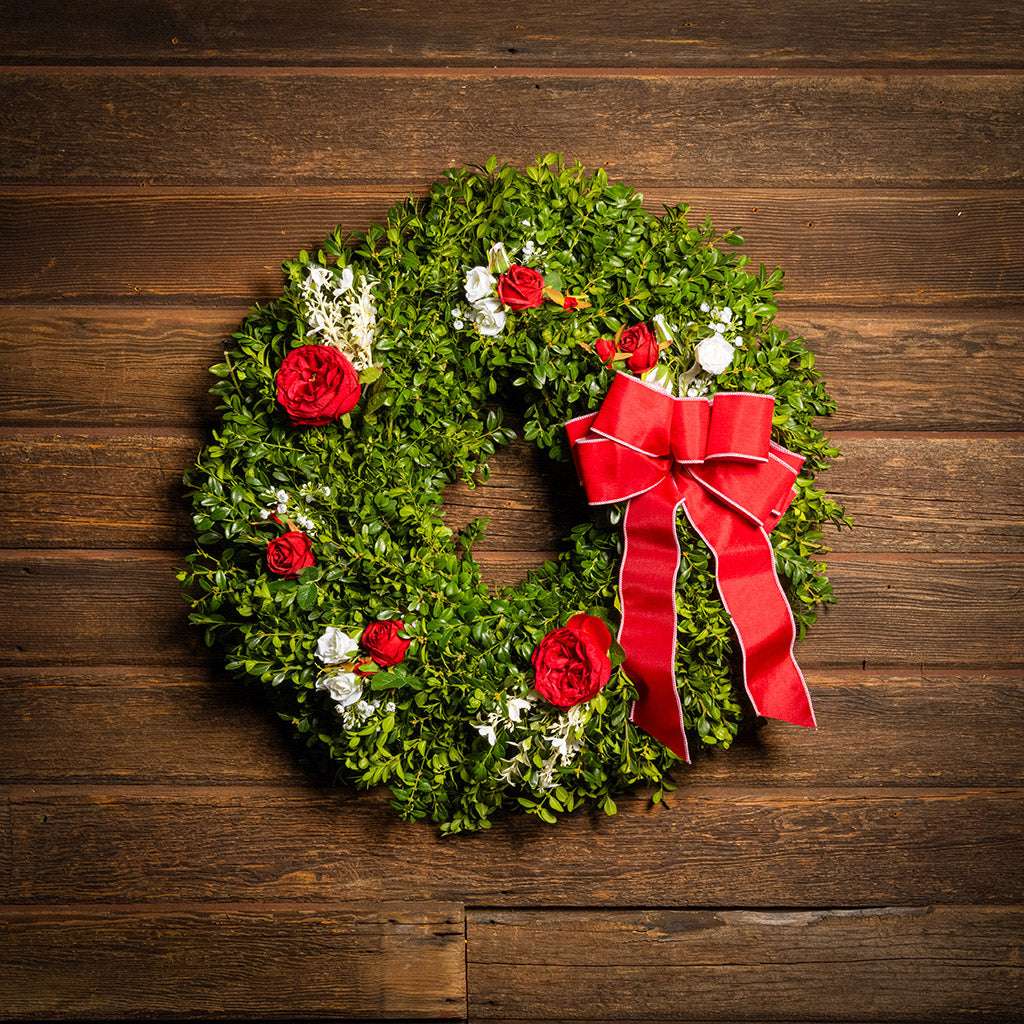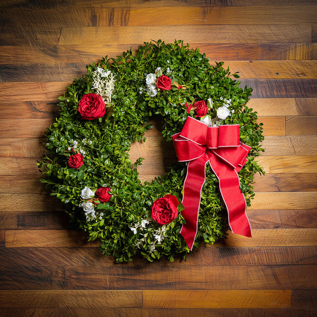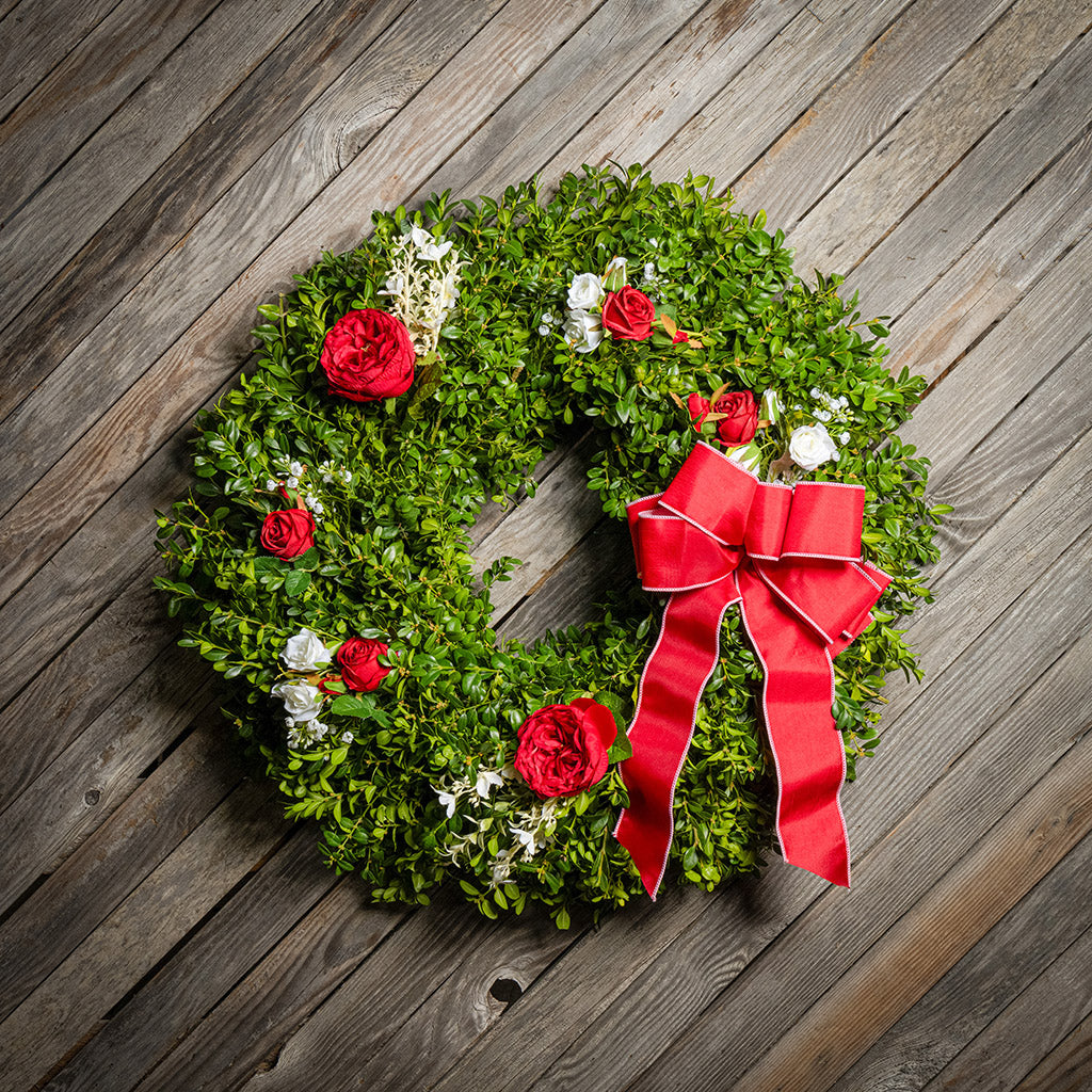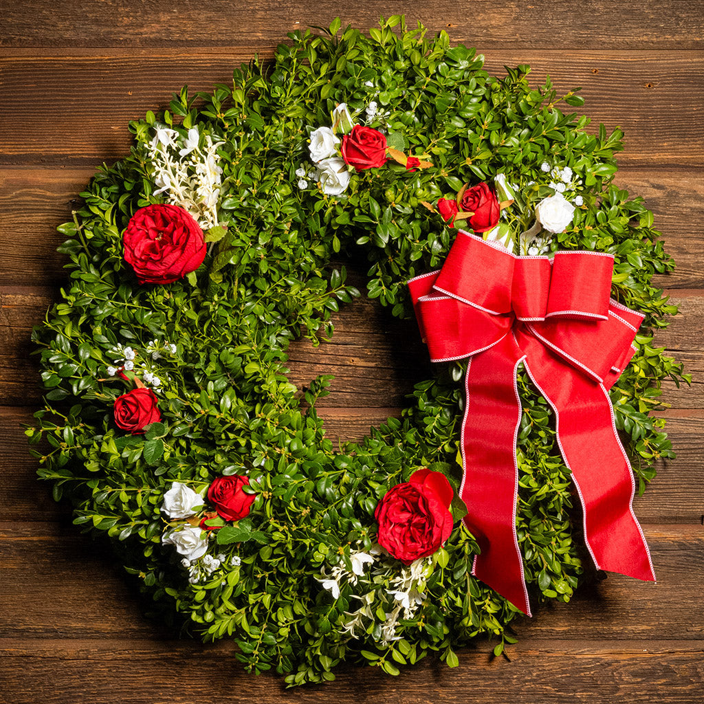 Materials: Fresh boxwood with faux red roses, faux white roses, and other faux white flowers with a red bow.