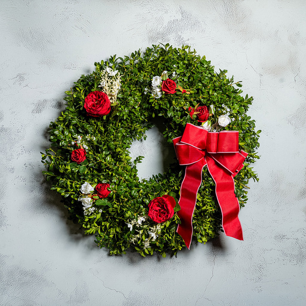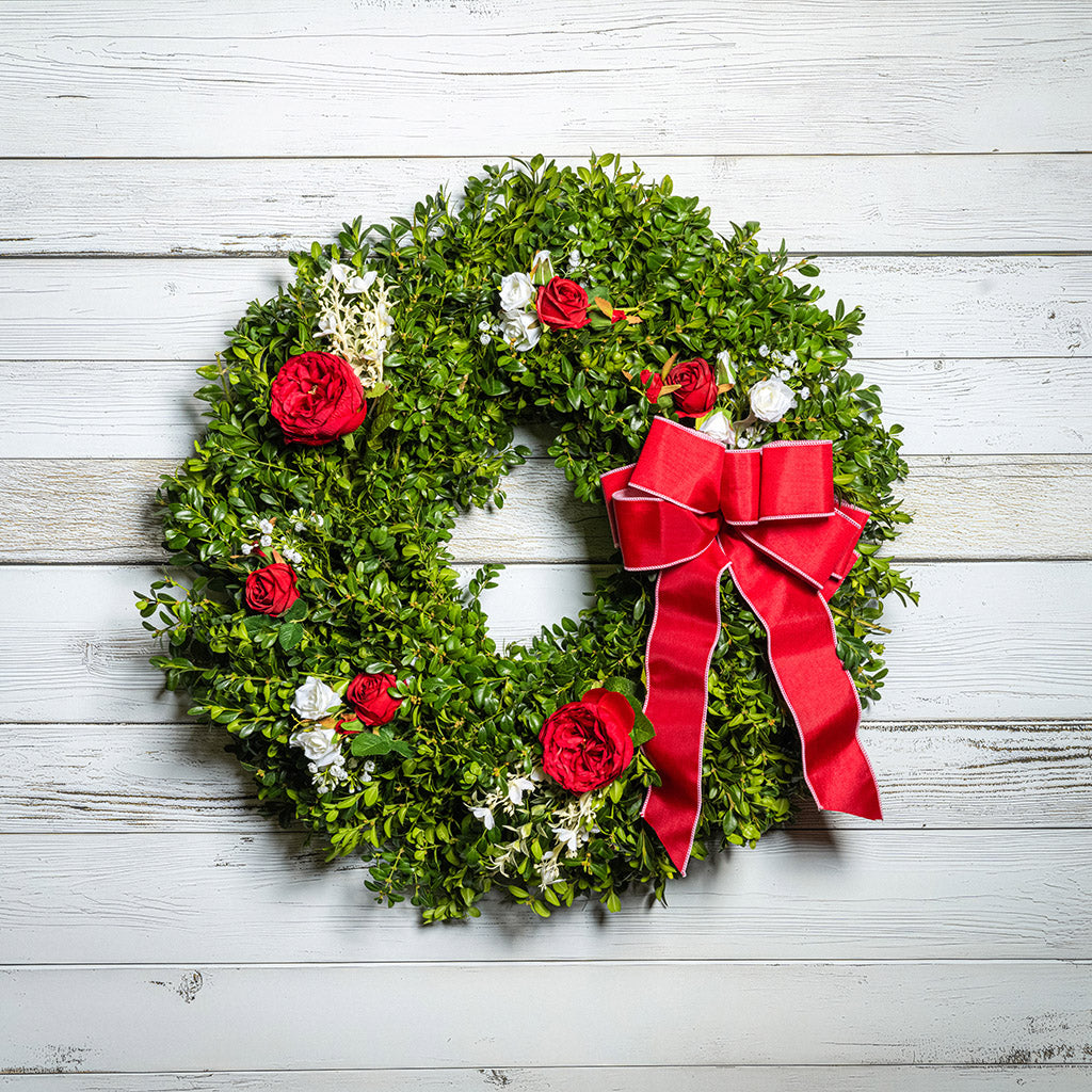 Send the spirit of love with our delightful and warm Sweet Love wreath! Handcrafted using fresh boxwood and adorned with faux (artificial) red roses, faux white roses, and additional faux white flowers, this graceful 26” wreath is a sight to behold! Finished with a vibrant red bow, this splendid spring creation will surely add charm and delight to any seasonal decor with its classic style. Full of elegance and romance, this lush design is perfect for a birthday, Mother’s Day, or telling a special someone you love them.