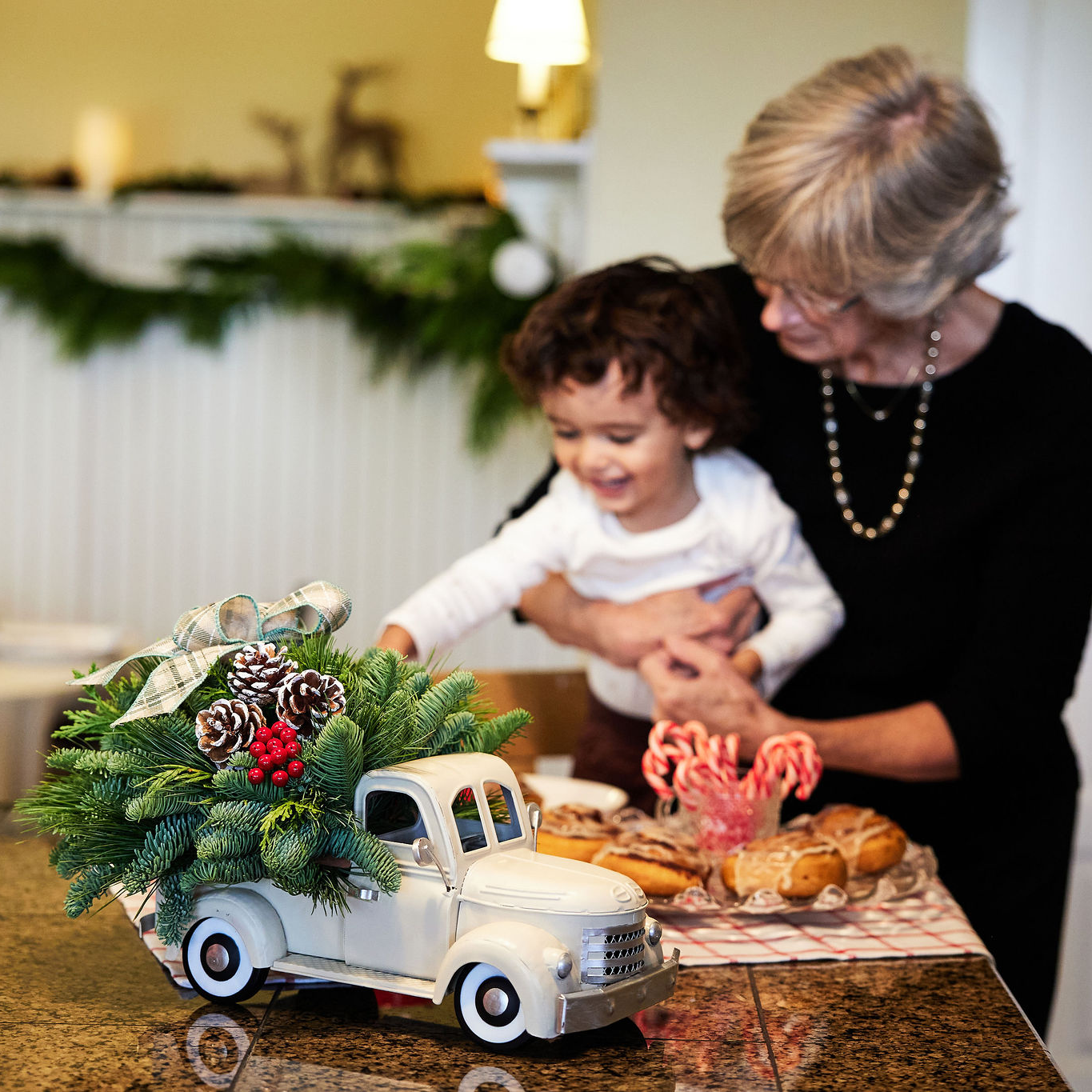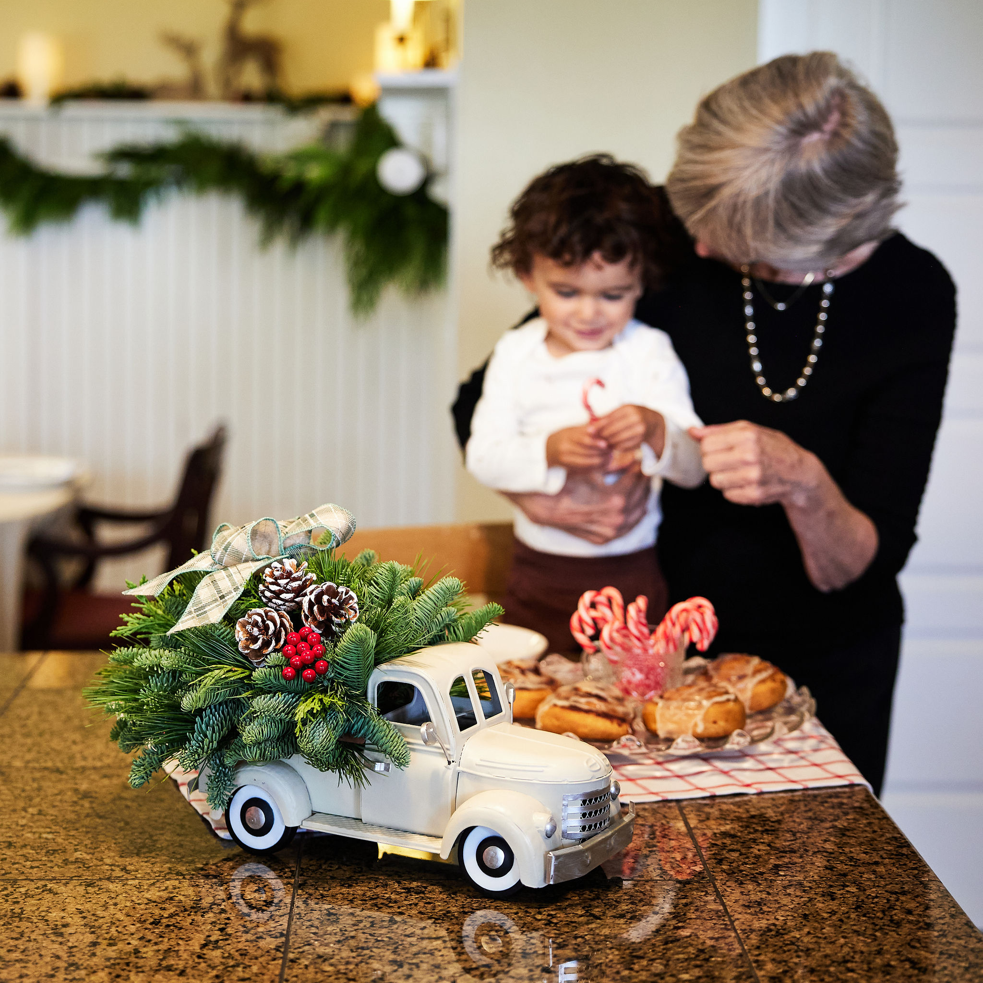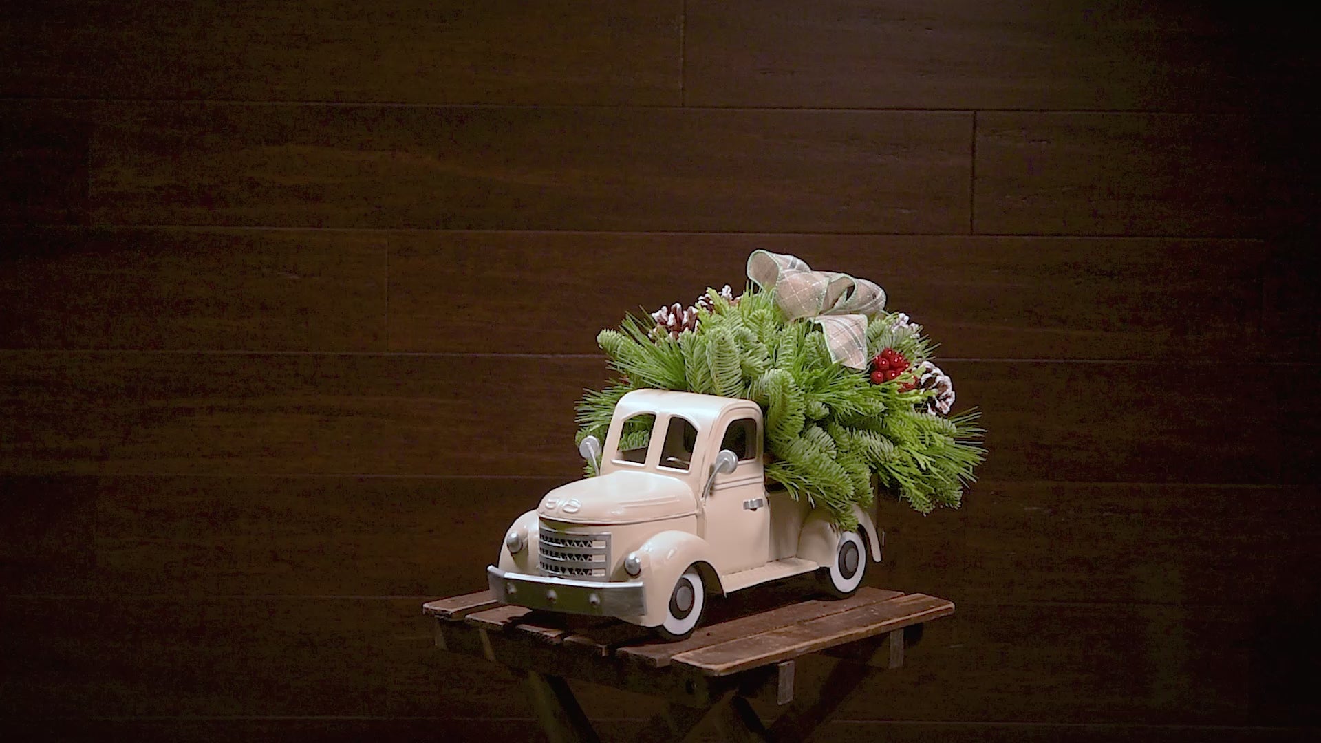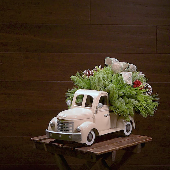 Beep beep! Deliver the cozy spirit of the season right to your door with our Through the Woods centerpiece! Reminiscent of a nostalgic holiday drive through snow-dusted pines, it features a rustic, metal cream-colored vintage truck as its base, bursting with woodland charm and seasonal cheer. Tucked into the truck’s open bed is a lush mix of noble fir, cedar, and pine, accented with faux red berries and frosted pinecones. A classic sage plaid bow sits atop the greenery, adding a timeless touch. Perfect for gift giving or keeping for yourself, this centerpiece makes a stunning statement for a festive table or to haul in a little extra Christmas magic to someone special. Santa’s sleigh isn’t the only ride delivering joy this year!