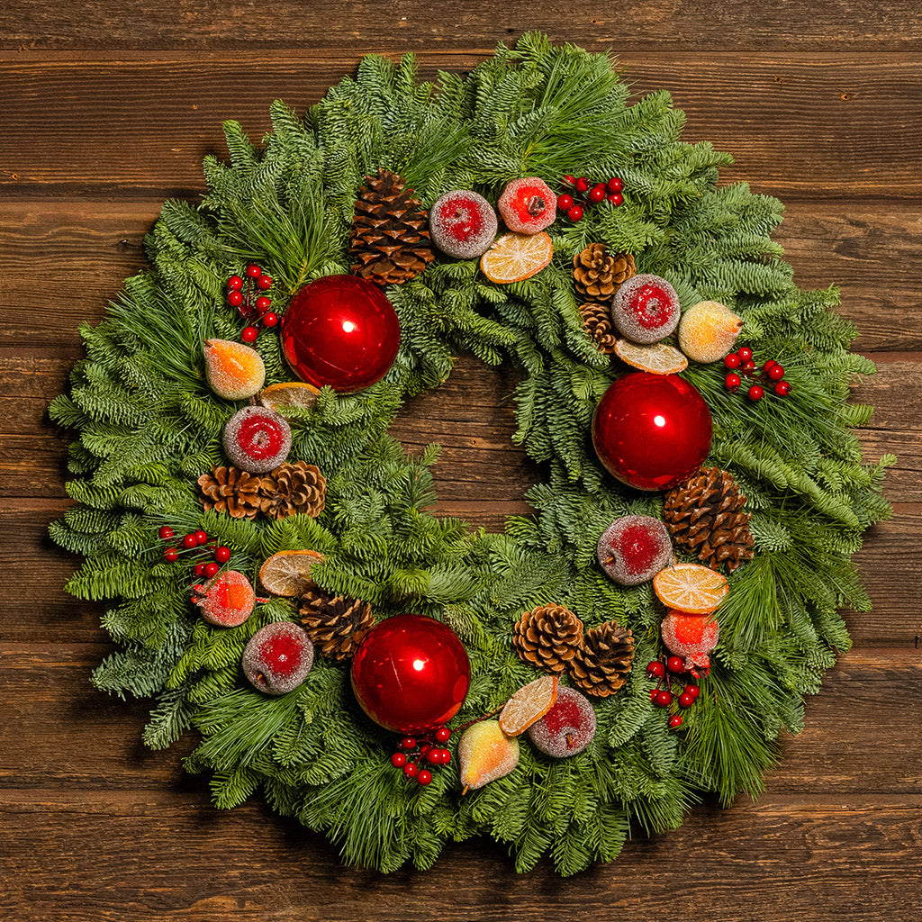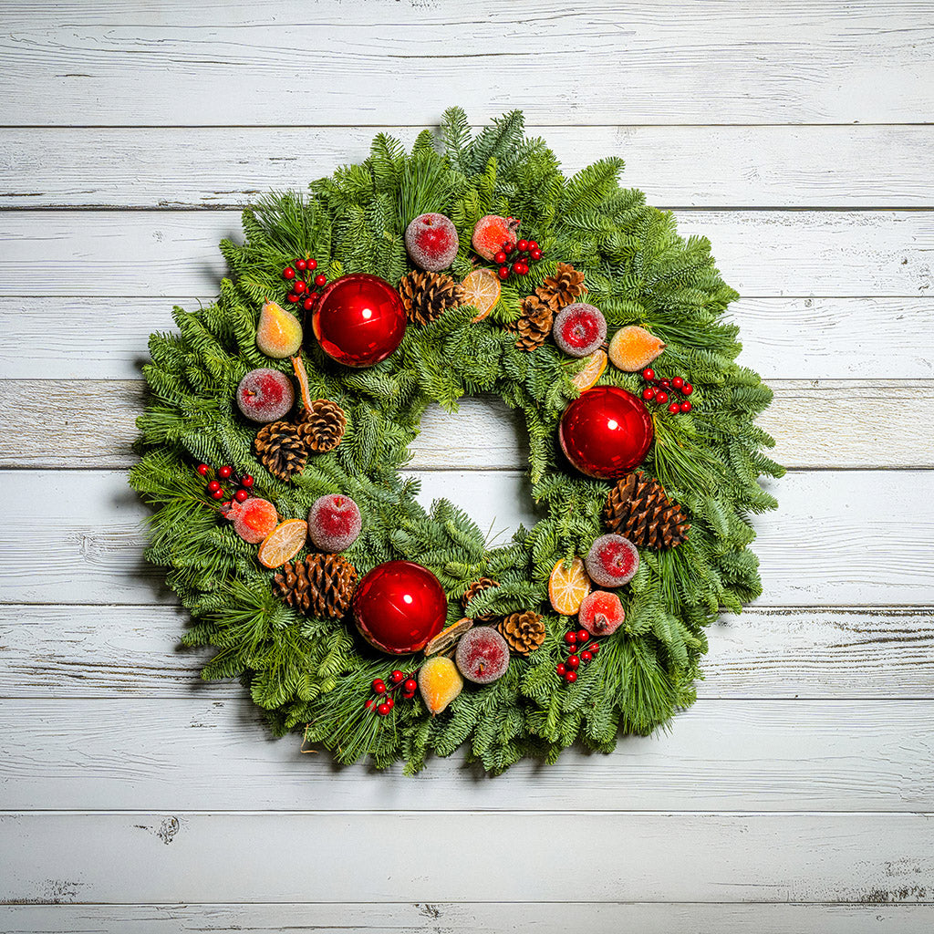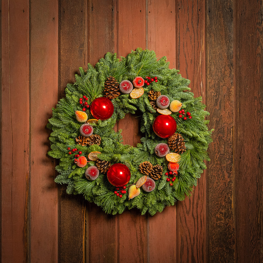 Wreaths absorb moisture through their cut ends. To increase the health and lifespan of your wreath, spritz the back with water every 2-3 days. Evergreens will drink the water, and you will find your wreath to be more fragrant and last longer.