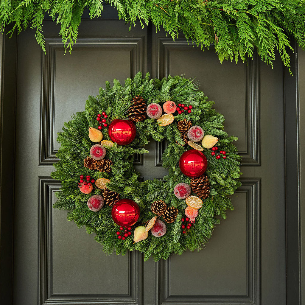 Materials: noble fir and pine with frosted faux holiday fruit, red ball ornaments, faux red berries, and natural pinecones