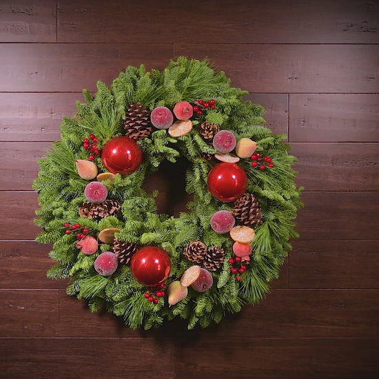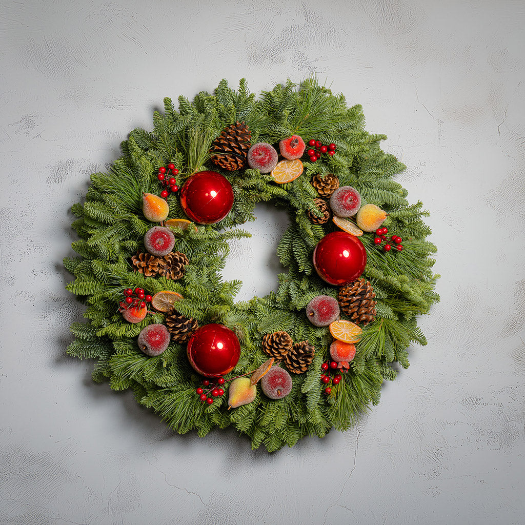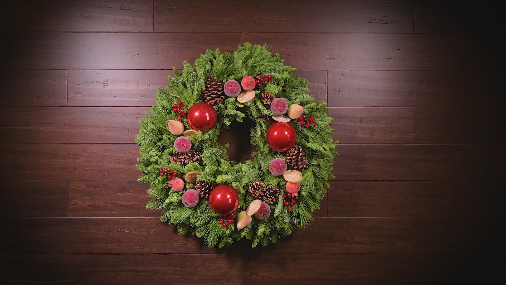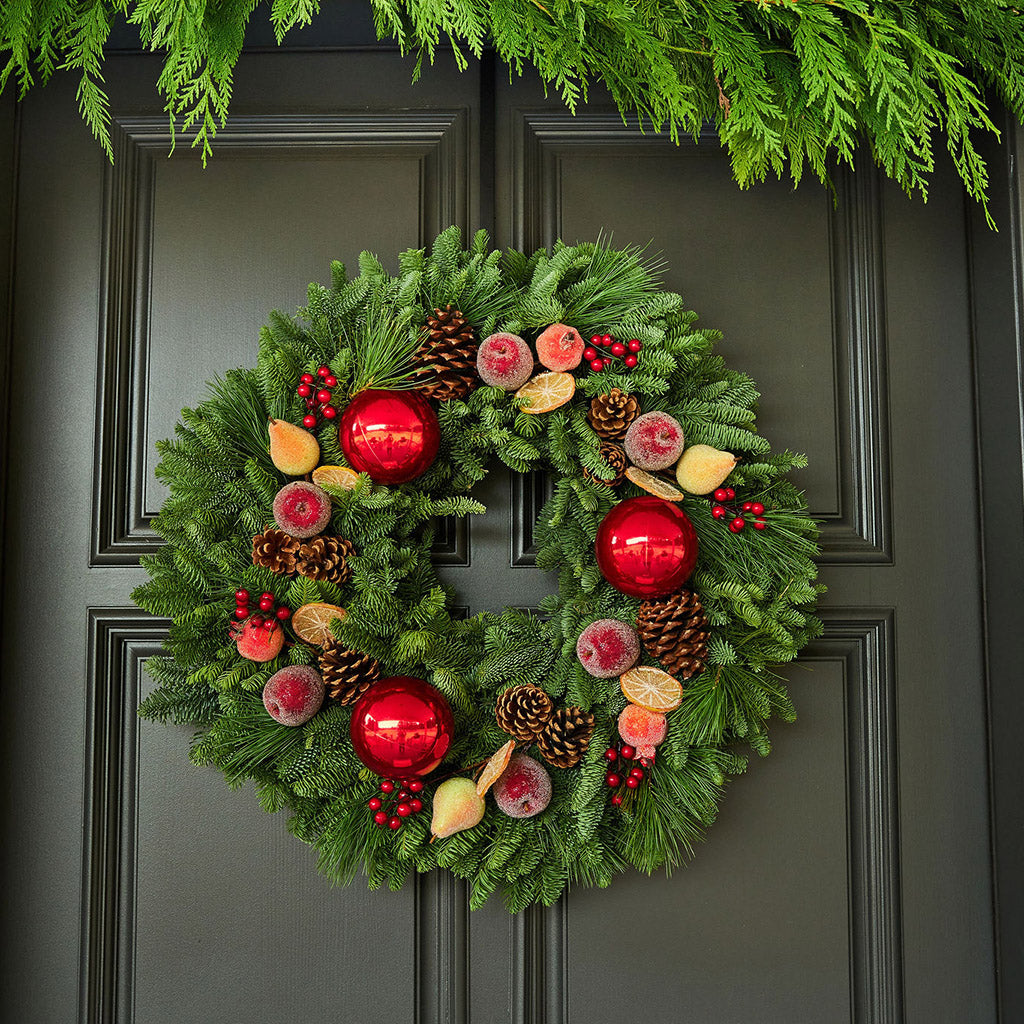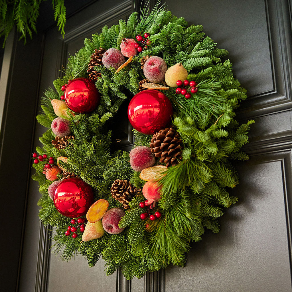 Feel yourself walking through a festive colonial town with our sophisticated yet traditional Winter Orchard wreath. Adorned with gorgeous faux frosted apples, pears, pomegranates, and lemon slices, its lush base of fresh noble fir and pine also includes faux red berries and real pinecones to create a perfect blend of classical artistry and joyful holiday spirit. This exquisite design is reminiscent of the timeless beauty of Della Robbia style, a classic look that marries elegance with natural charm. It’s the perfect way to celebrate the season with a nod to tradition and a splash of modern festivity.